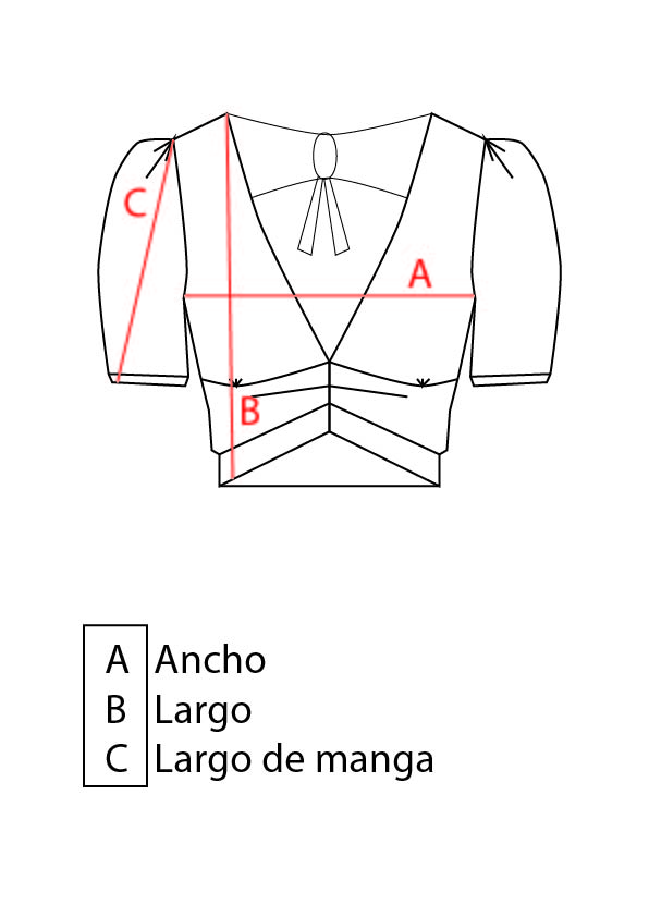MEDIDAS: (A) ANCHO DE SISA A SISA: 46CM / (B) LARGO: 66CM (C) LARGO DE MANGAS: 48CM