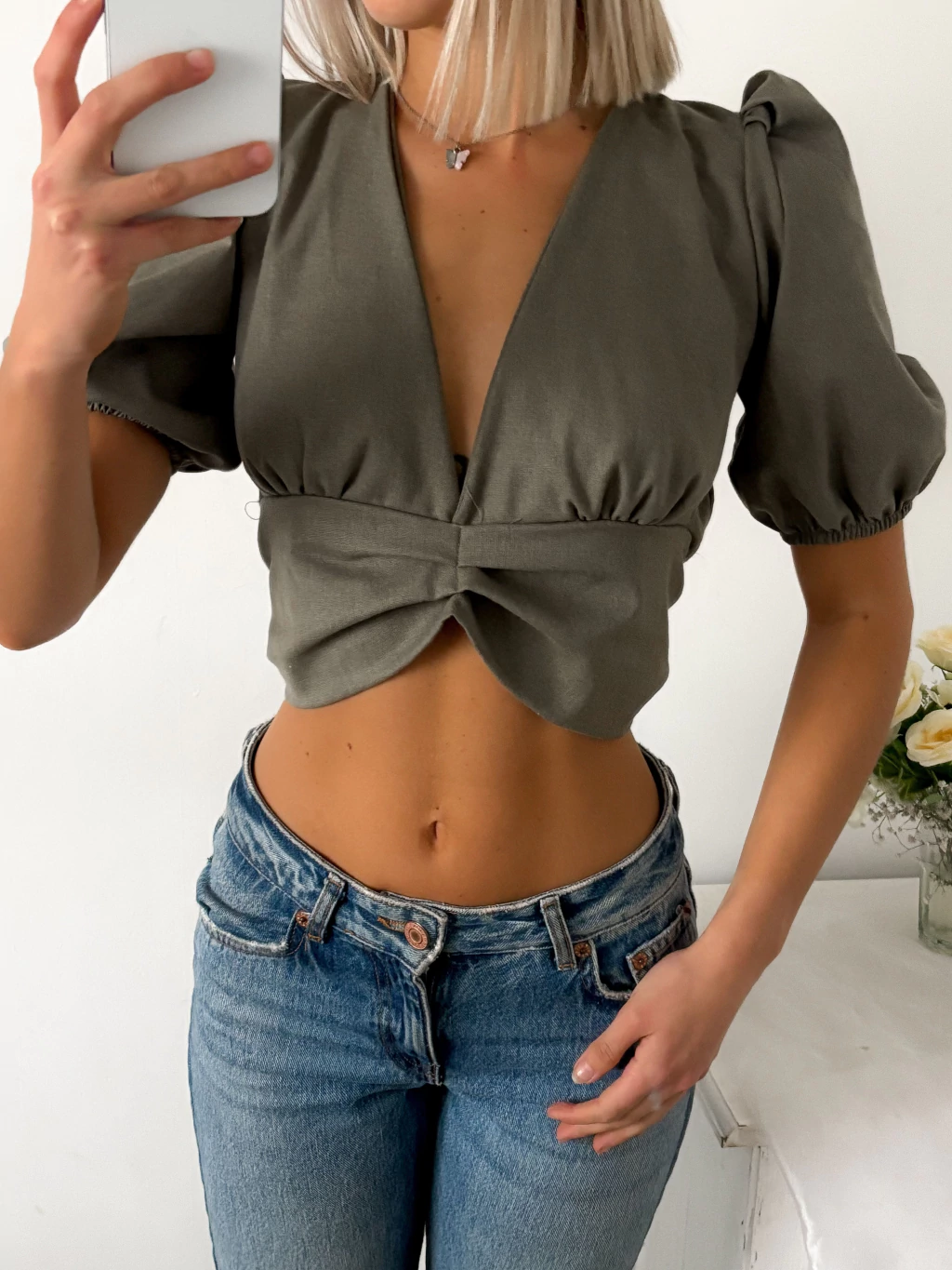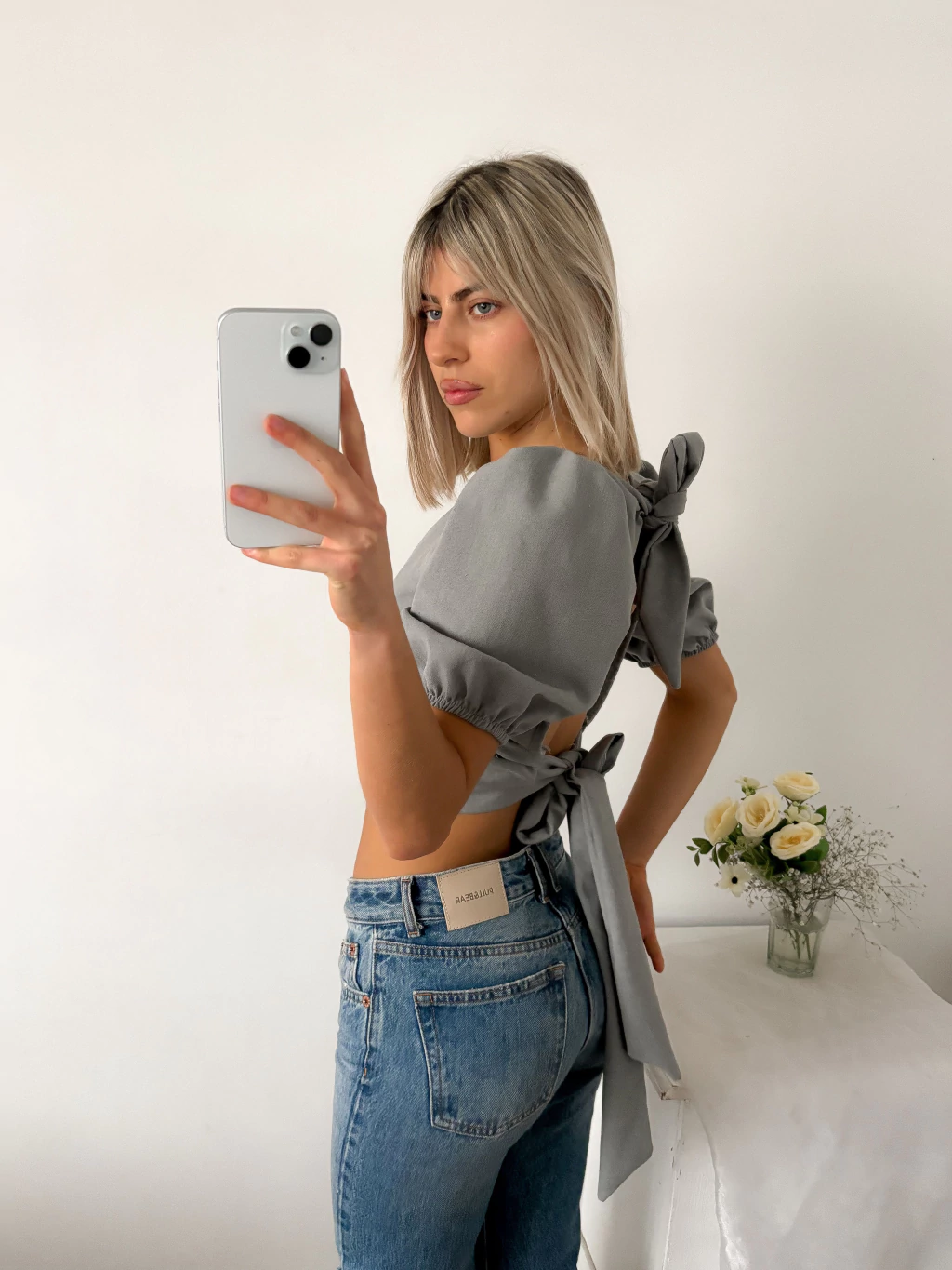 Esta blusa es puro encanto 😍 Tiene un detalle cruzado bajo el busto que realza la silueta de forma súper favorecedora y un escote en la espalda que es simplemente sexy y delicado a la vez. Lo mejor es que podés ajustarla con el lazo trasero 🎀