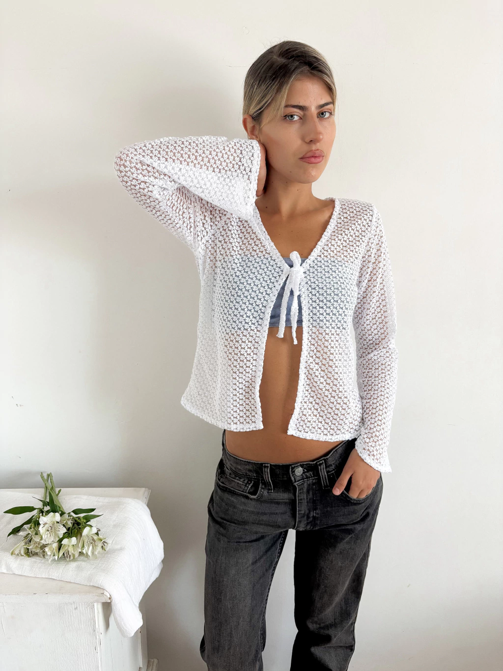 Tiene escote en “V” y tiras para anudar que permiten adaptarla al cuerpo y marcar la silueta. Su tejido calado tipo crochette es tendencia total esta temporada💫