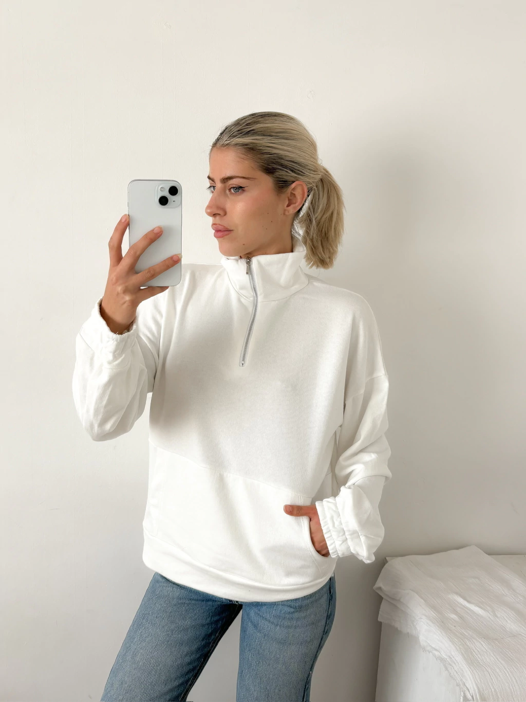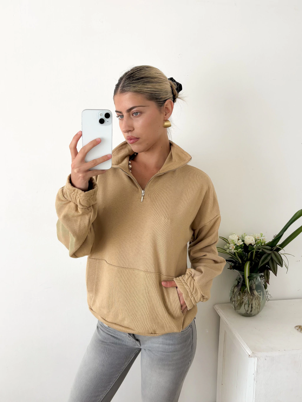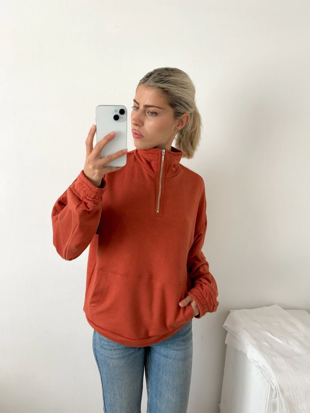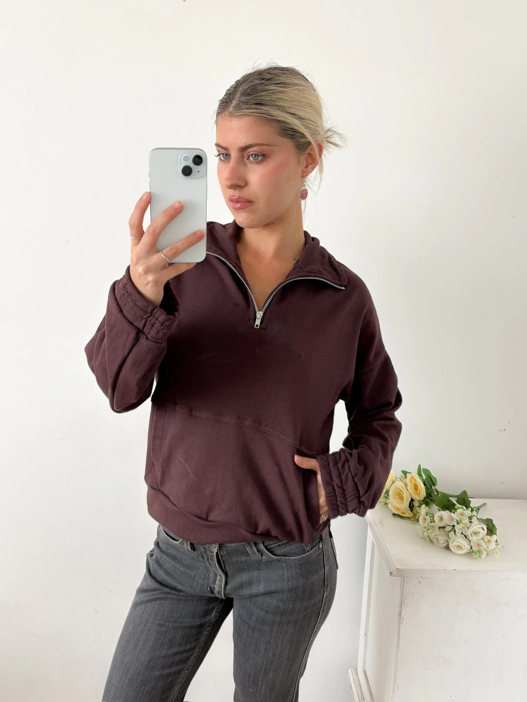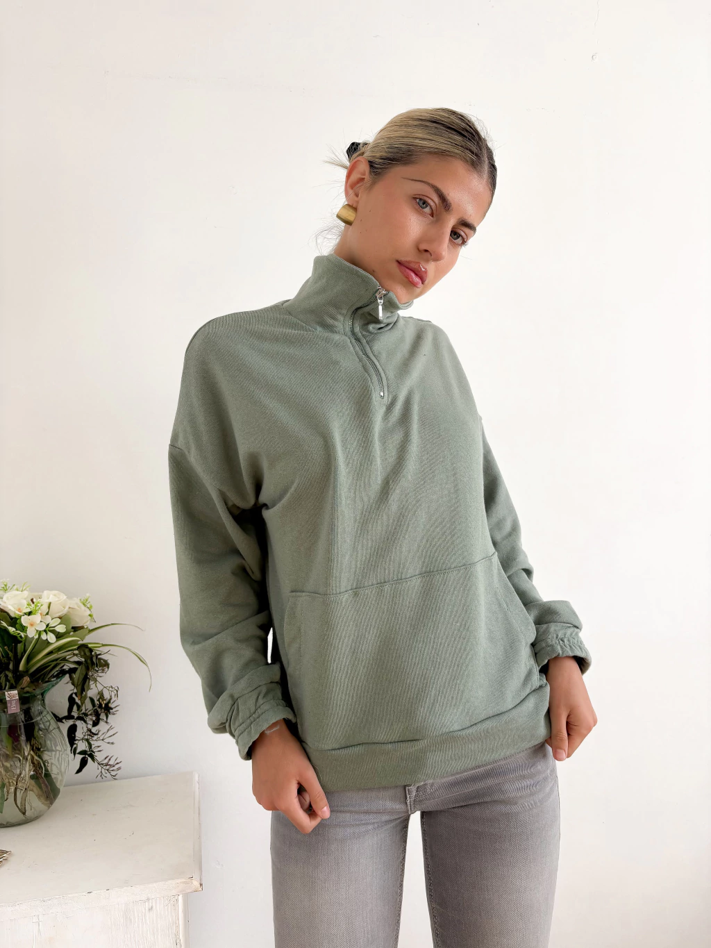 Buzo rustico cuello alto con cierre, bolsillo canguro y puño elastizado