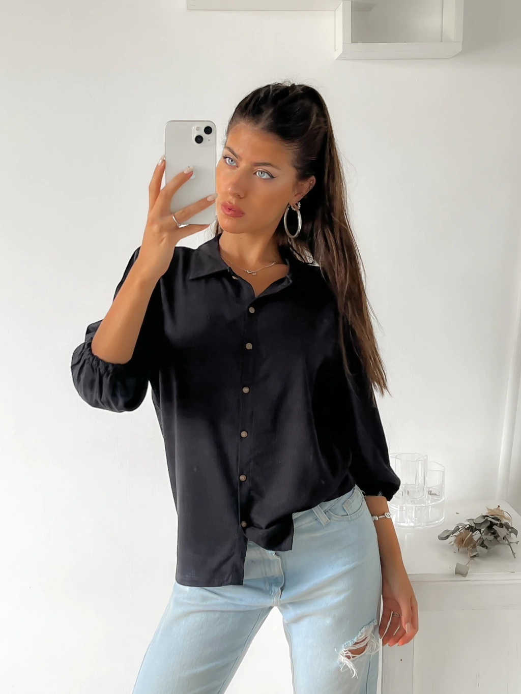 Camisa de lino, material que nunca falla: elegante y fresco 🌿 Con manga 3/4 tipo globo y elástico en el borde para que quede armadita y con ese aire canchero que suma siempre 💫