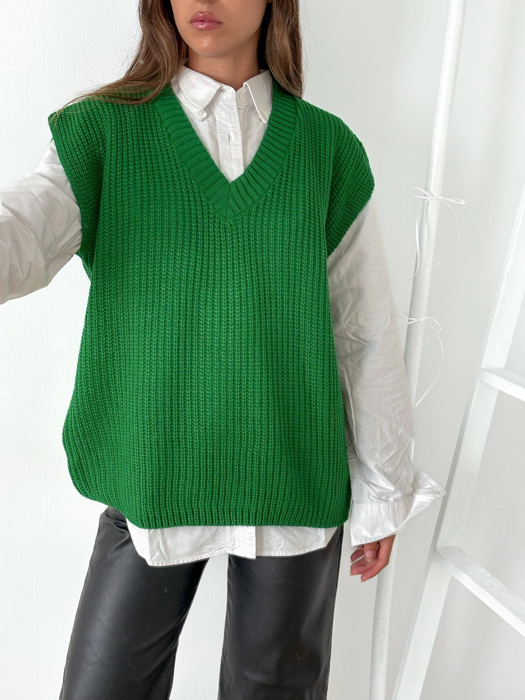 Tiene un corte larguito, por debajo de la cadera y un escote en V súper favorecedor. Es versátil: podés usarlo con camisas manga larga o corta, encima de una remera básica, con camisas oversize más largas o hasta solo, para un look más relajado.