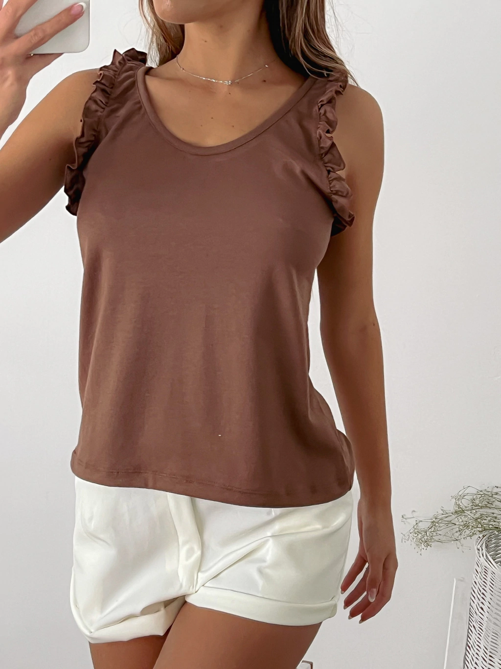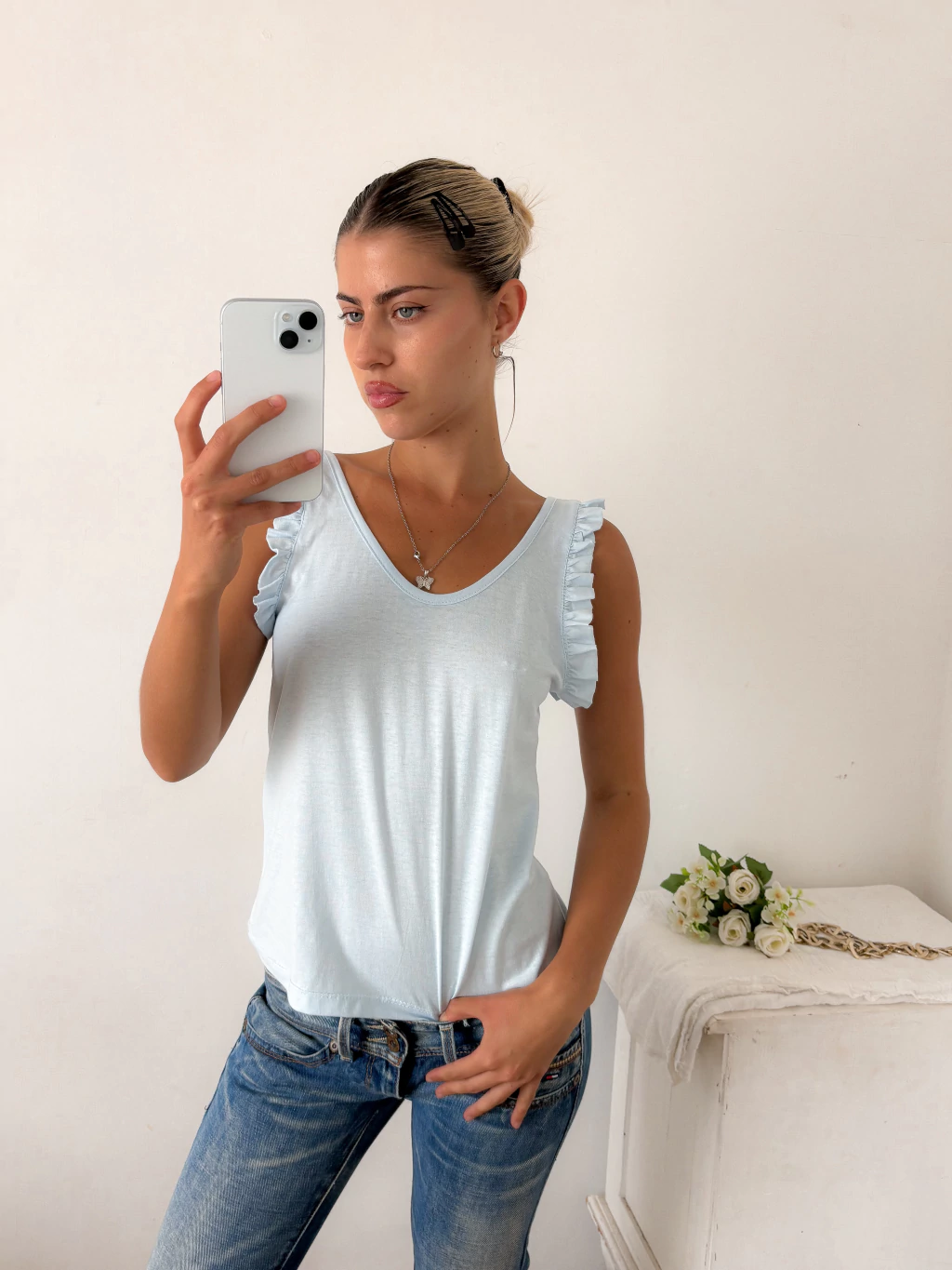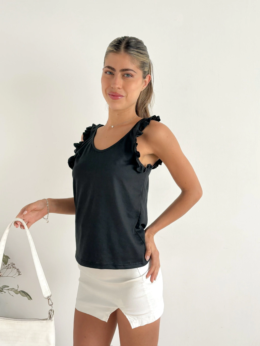 Tiene un escote en U que queda súper favorecedor y esos voladitos en los breteles y la sisa le dan un toque tierno y romántico que amamos 💕