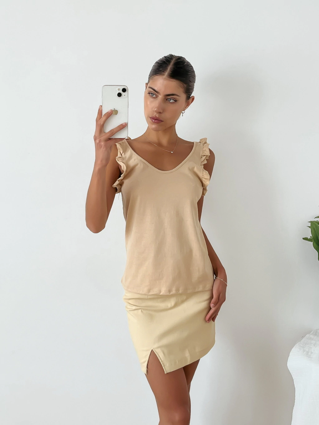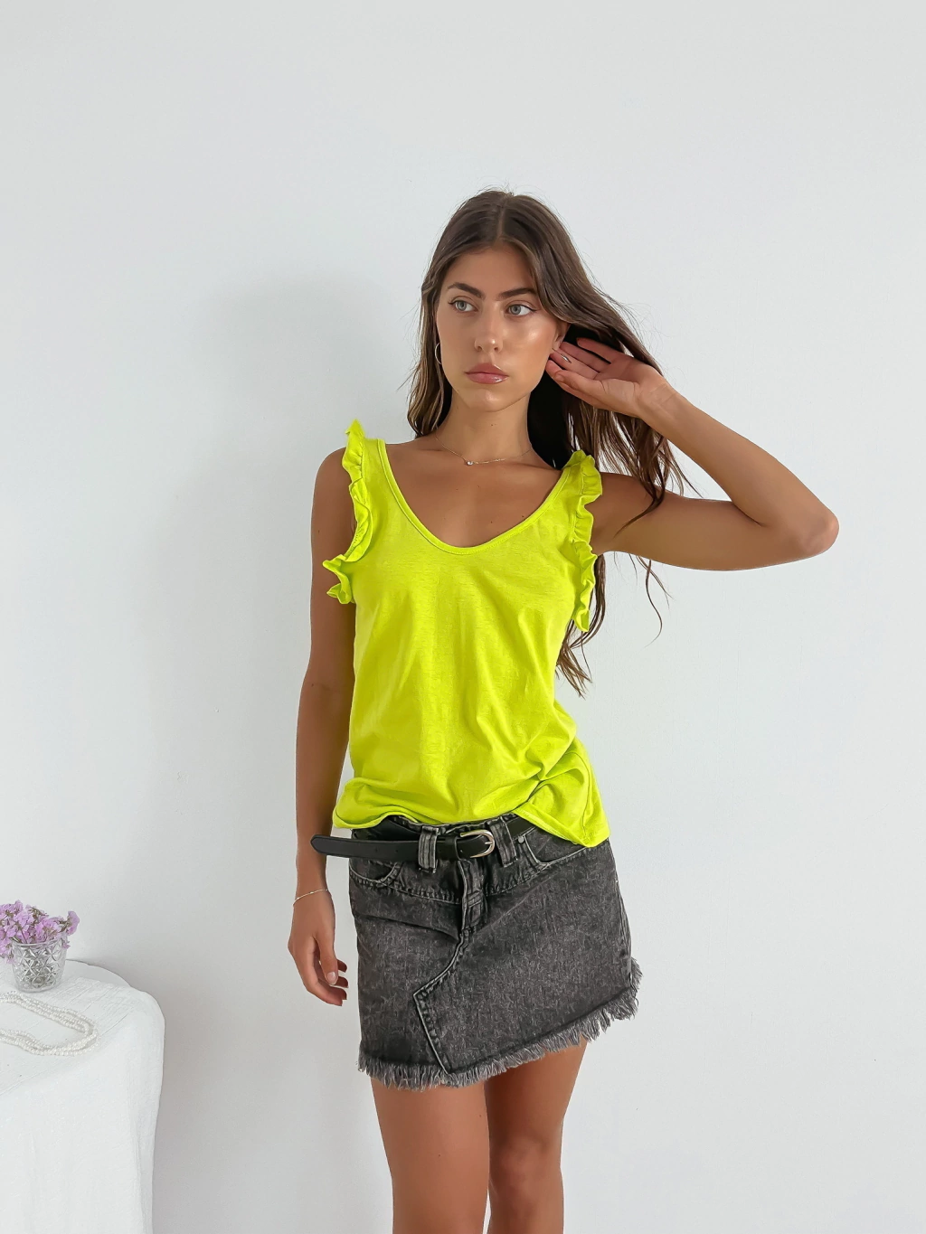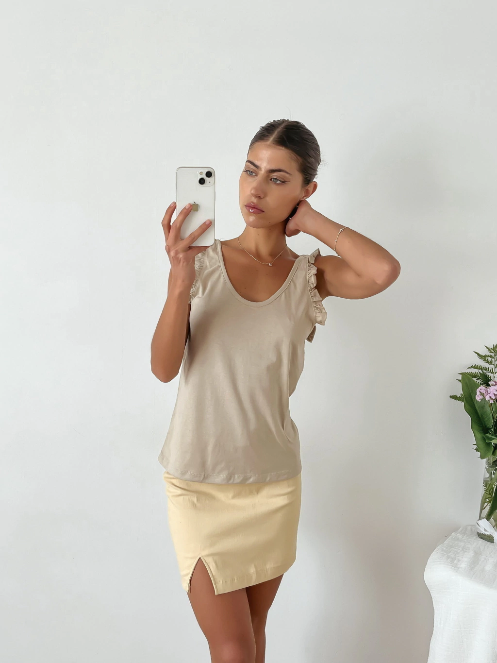 Tiene un escote en U que queda súper favorecedor y esos voladitos en los breteles y la sisa le dan un toque tierno y romántico que amamos 💕