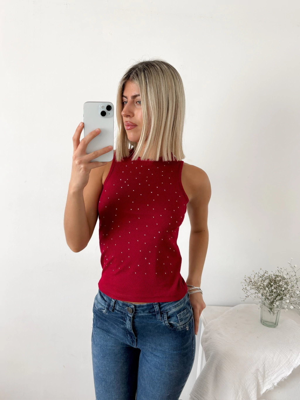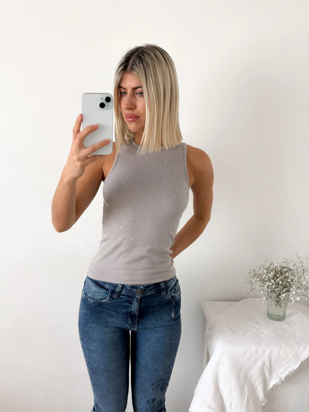 Esta musculosa Rib con Brillitos la vas a amar porque es comodísima. Deja los brazos libres para moverte sin problema y además tiene esos mini brillitos que están súper en tendencia ✨🔥