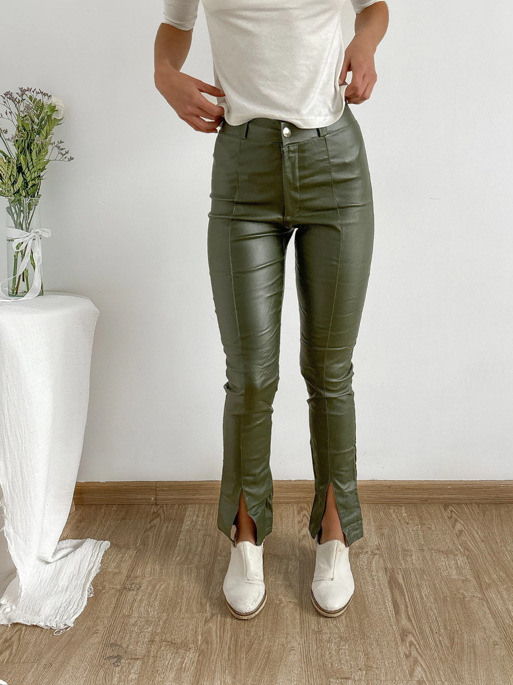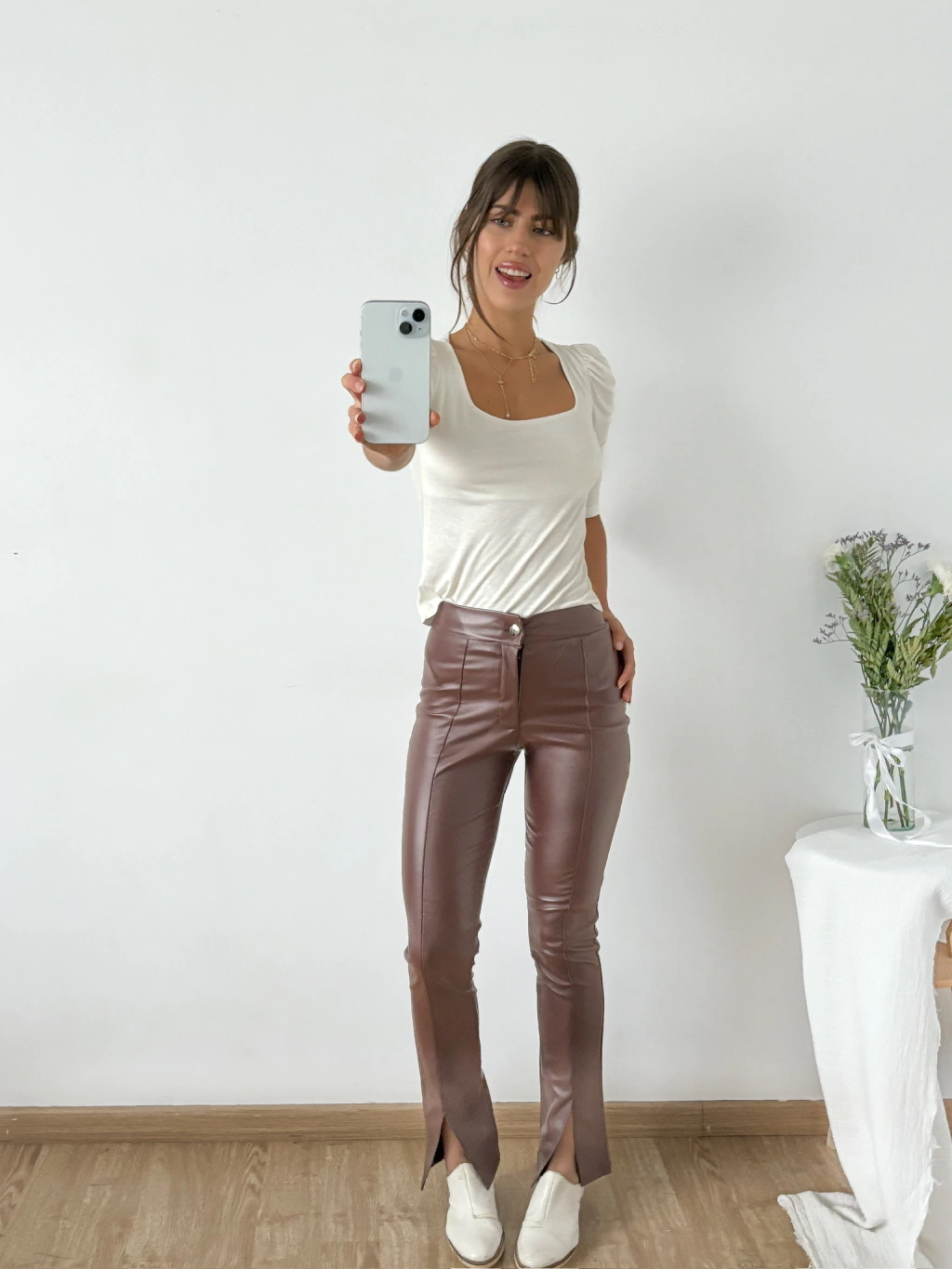 Pantalón de bengalina engomada con recorte delantero y tajo en botamanga