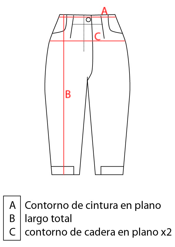 TALLE M: (A) CONTORNO CINTURA: 74CM / (B) LARGO 96CM / (C) CONTORNO DE CADERA: 104CM