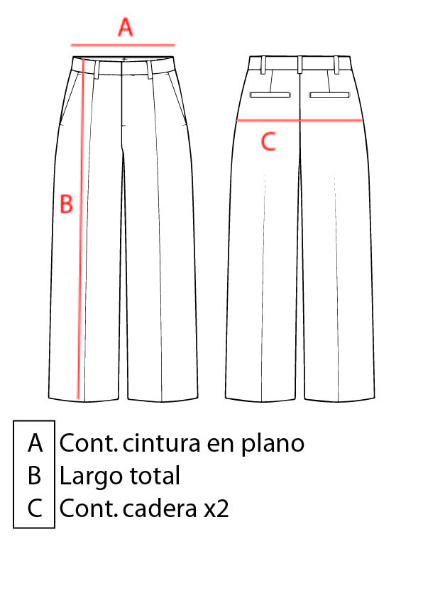 TALLE L: (A) CONTORNO DE CINTURA: 76CM / (B) LARGO 104CM / (C) CONTORNO DE CADERA: 96CM