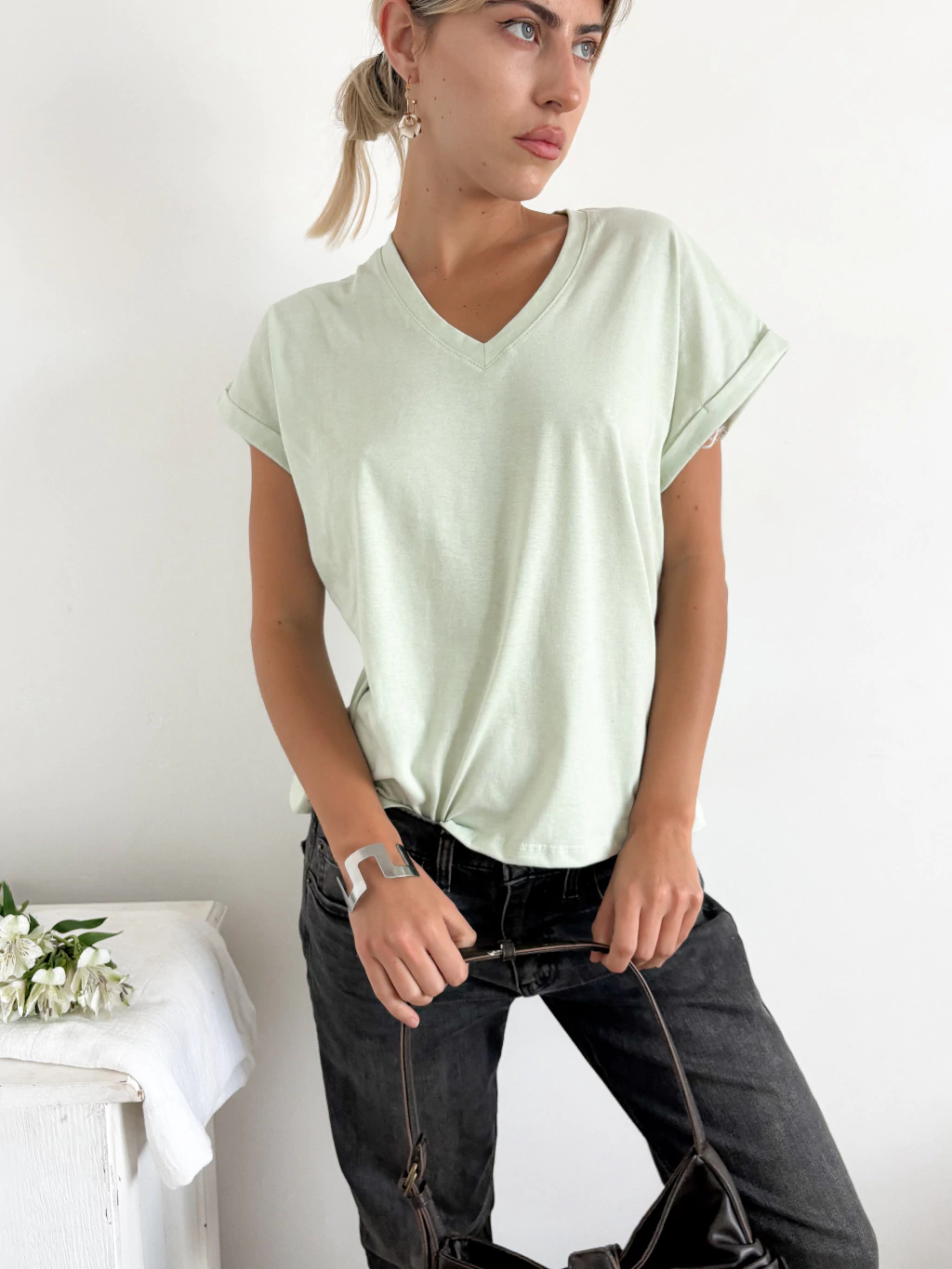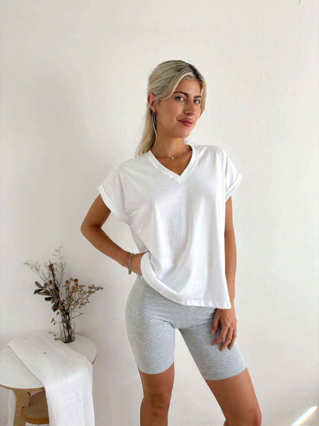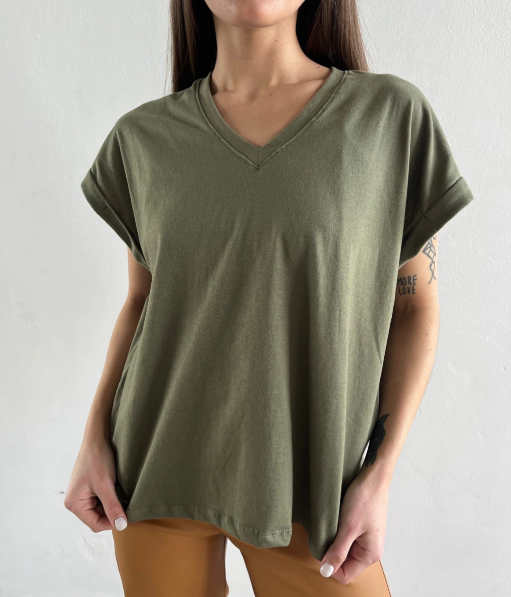 Está hecha en jersey 100% algodón, super suave, con mangas rebatibles que no aprietan ni molestan (sí, esas que dejan el brazo libre y cómodo todo el día 🙌). Escote en V, largo a la cadera y un calce holgadito que queda bien con jeans, shorts o faldas.