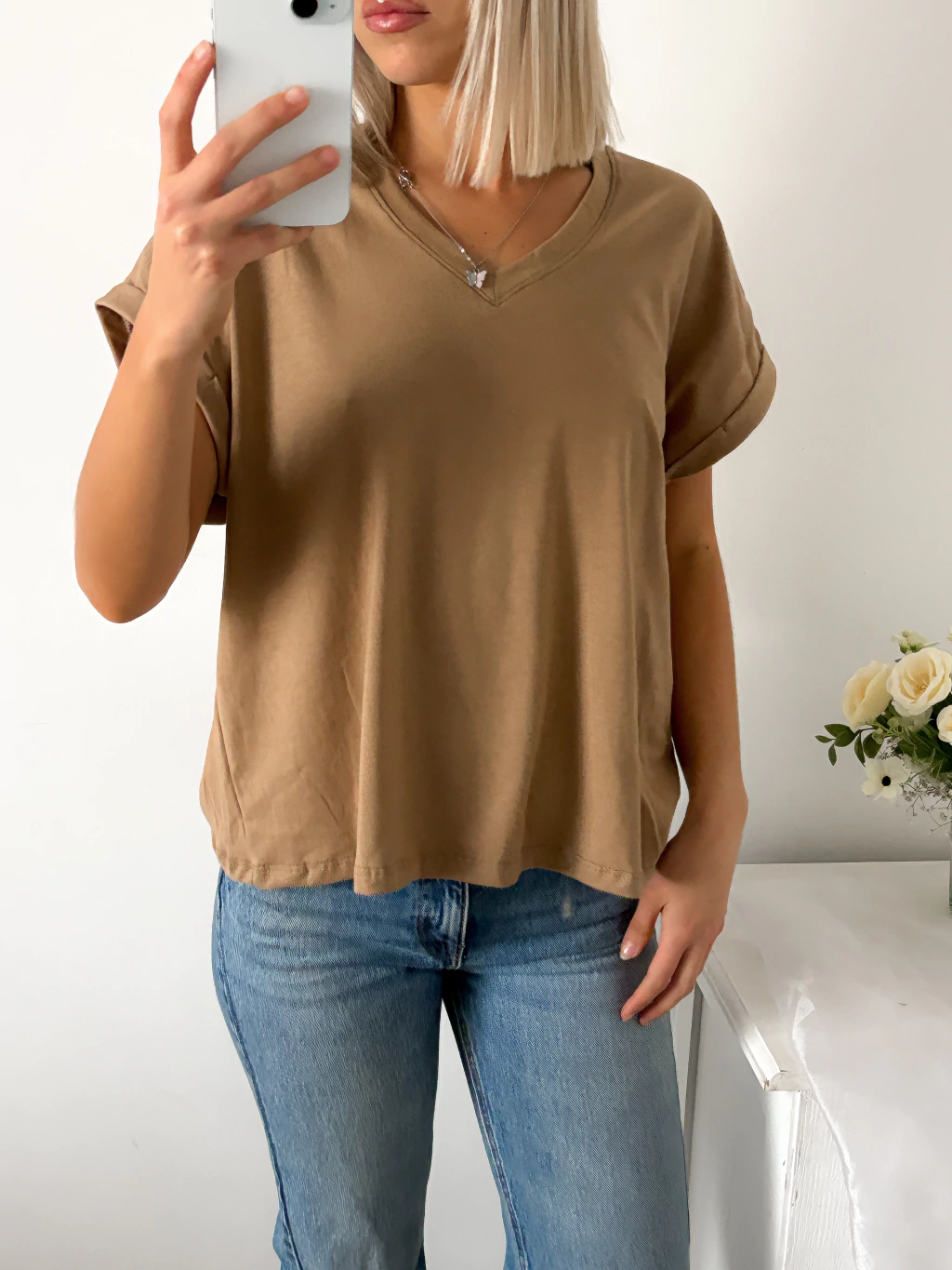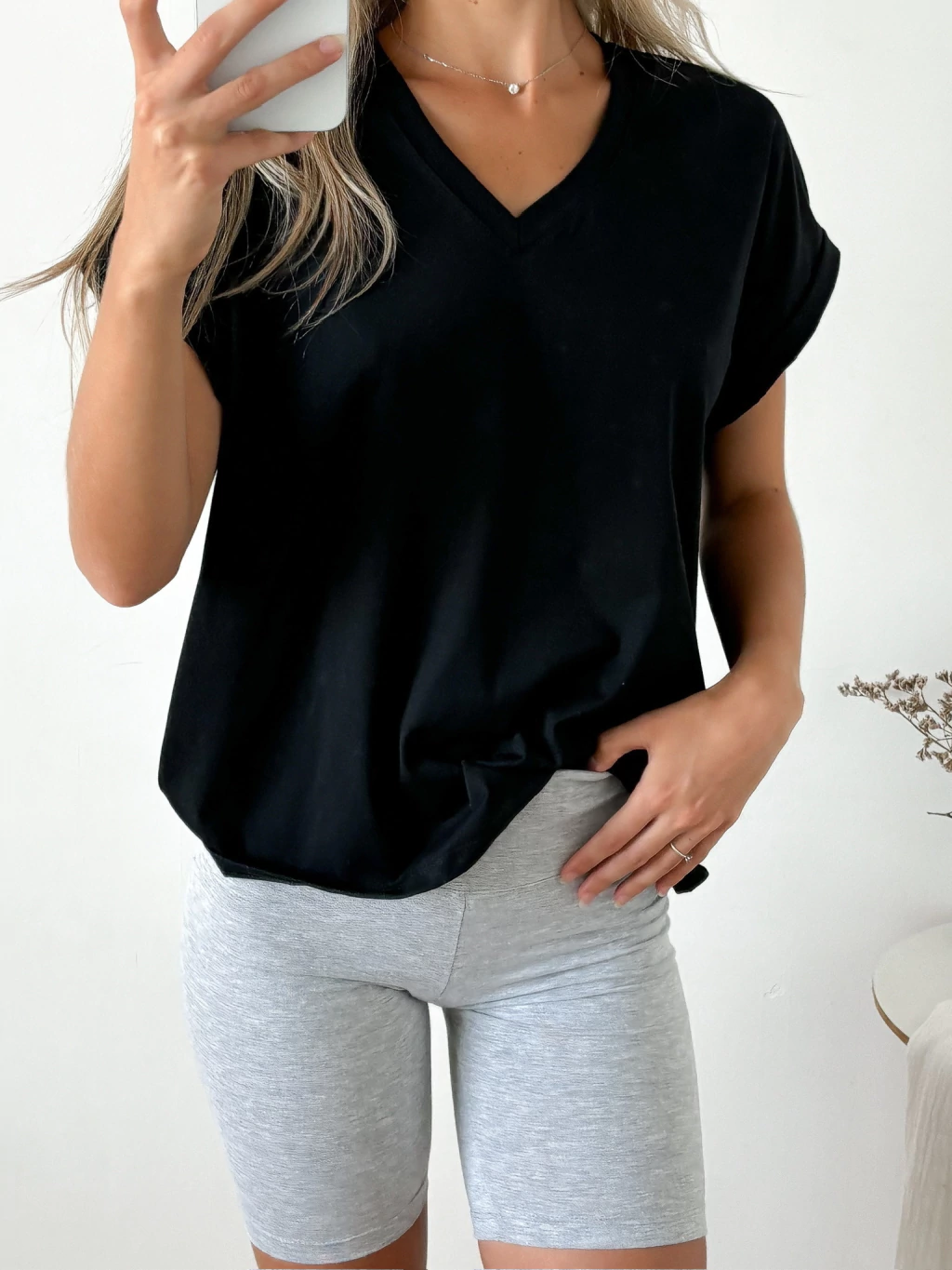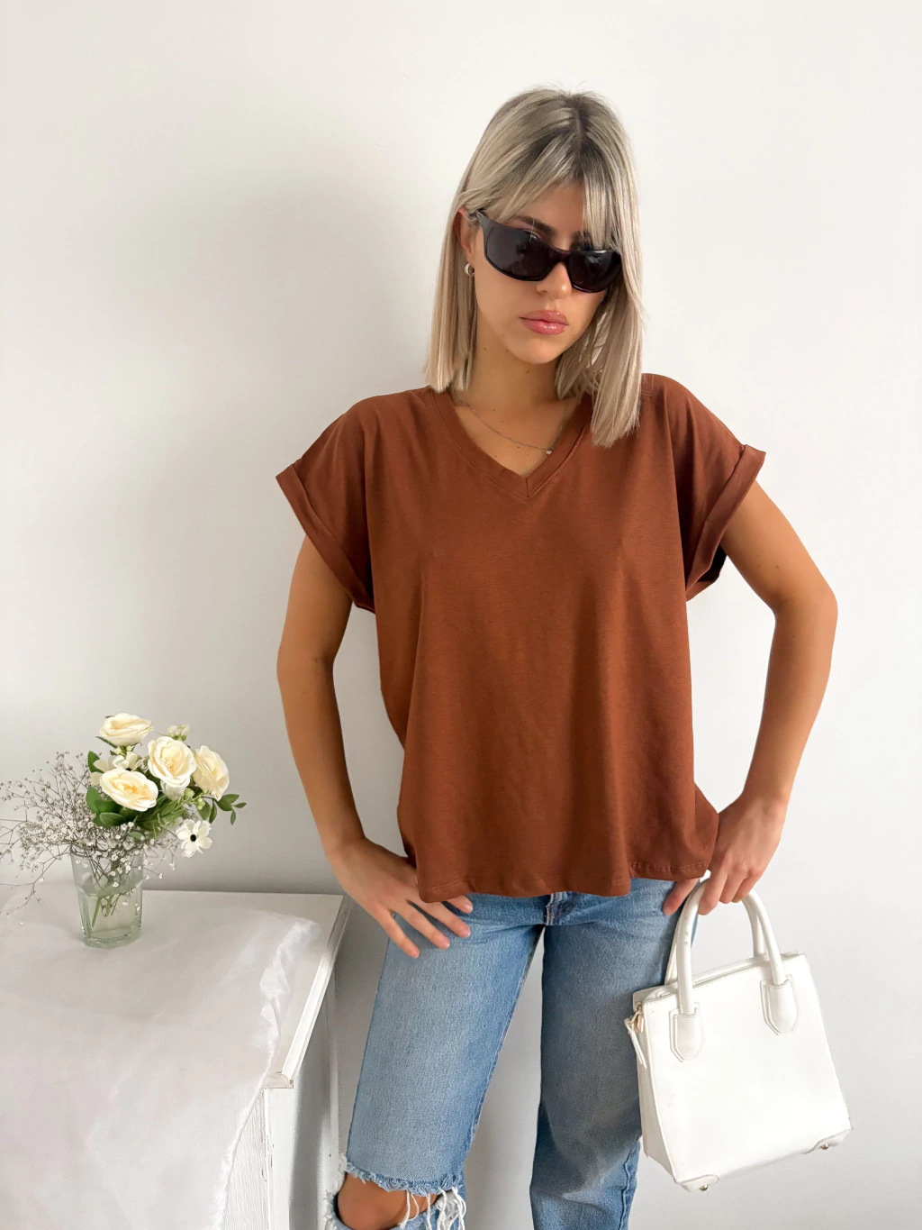 Está hecha en jersey 100% algodón, super suave, con mangas rebatibles que no aprietan ni molestan (sí, esas que dejan el brazo libre y cómodo todo el día 🙌). Escote en V, largo a la cadera y un calce holgadito que queda bien con jeans, shorts o faldas.