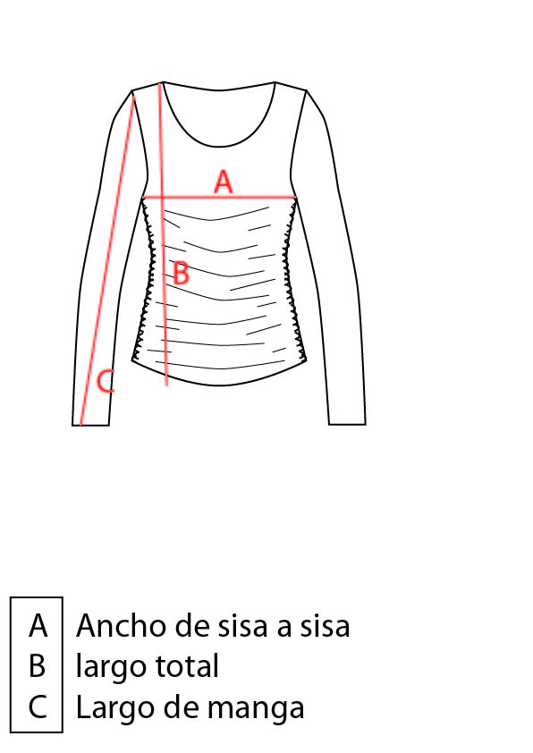 TALLE S: (A) ANCHO DE SISA A SISA: 34CM / (B) LARGO: 50CM / (C) LARGO DE MANGAS: 60CM