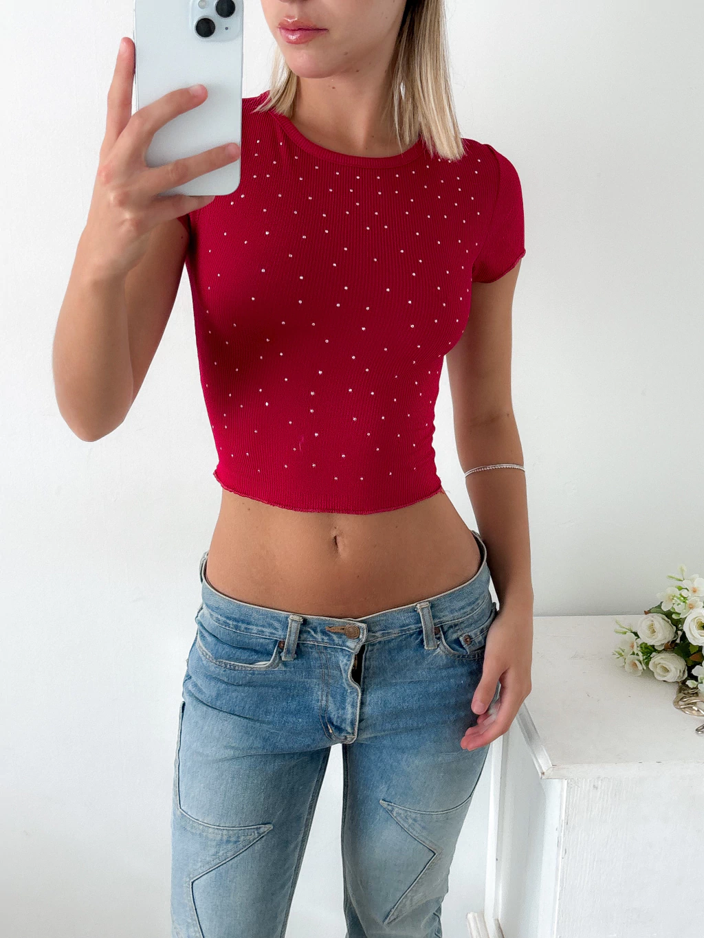 Este crop de ribb tiene el detalle de strass que le da un brillito único ✨ sumando ese toque femenino y canchero.