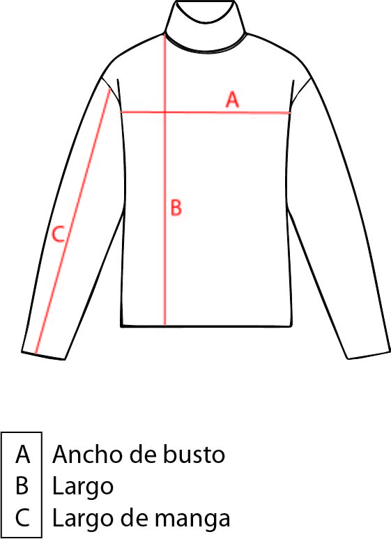 MEDIDAS: (A) ANCHO DE CADERA: CM / (B) LARGO: CM / (C) LARGO DE MANGAS: CM