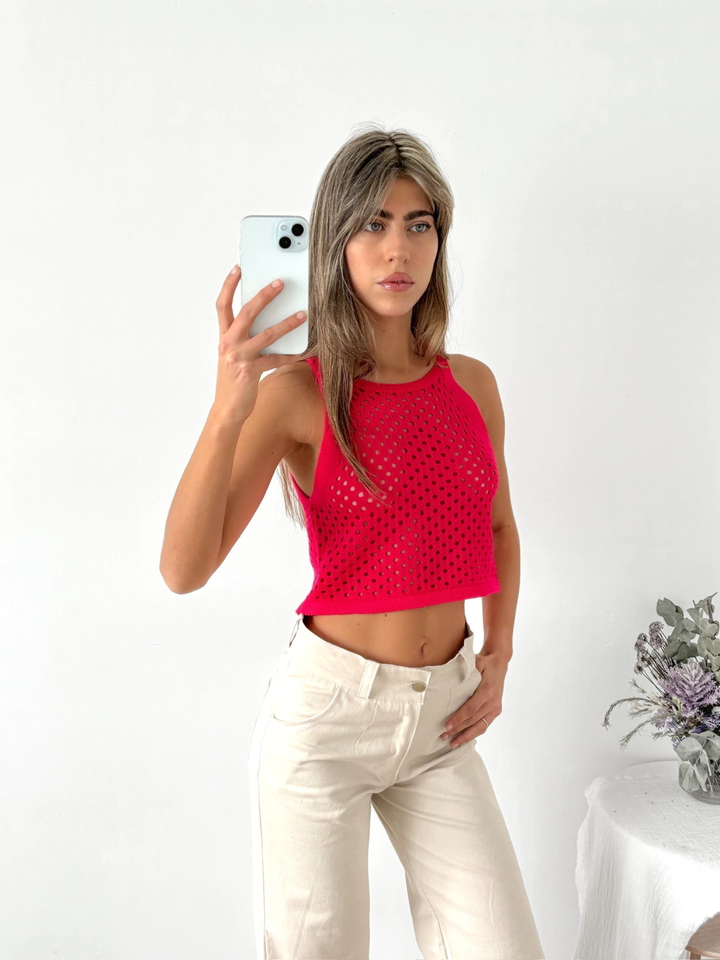 Con escote redondo y largo a la cintura, es cómodo, fresco y muy fácil de combinar. El tejido calado está en tendencia 🌸 y le da ese toque canchero y delicado que te hace ver divina sin esfuerzo.