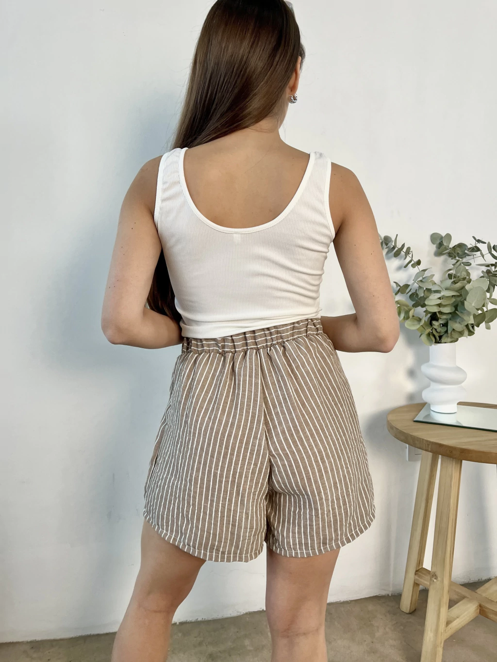 Short lino liviano cintura elastizada y cartera falsa con botones