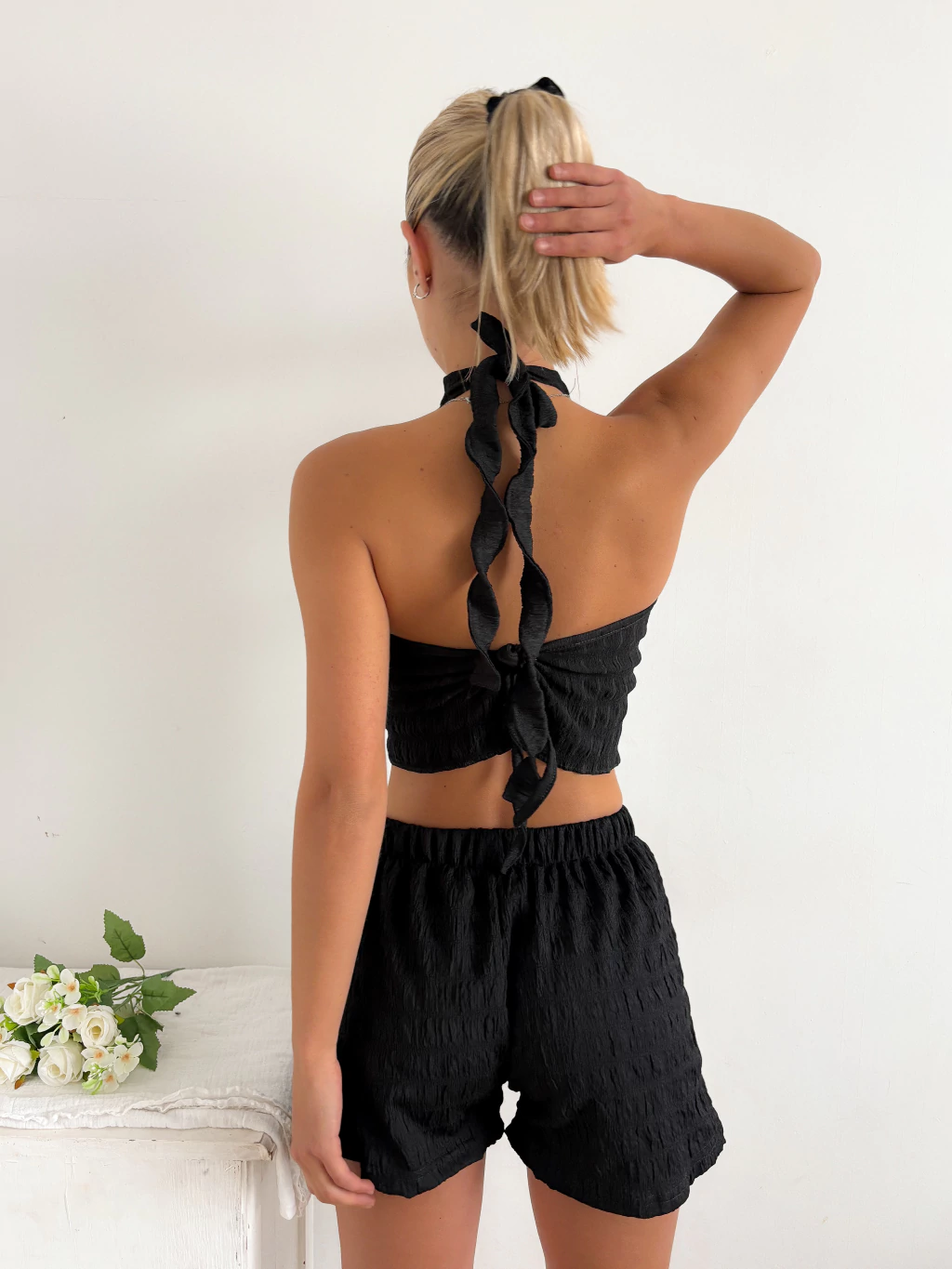 Este top es un MIL😍😍 El cuellito halter es lo más, porque estiliza un montón y le da un aire súper delicado, mientras que la espalda descubierta con el lazo queda sexy y femenina a la vez ✨ Lo mejor es que deja hombros y espalda al aire, resaltando esas partes de una forma súper linda y elegante.