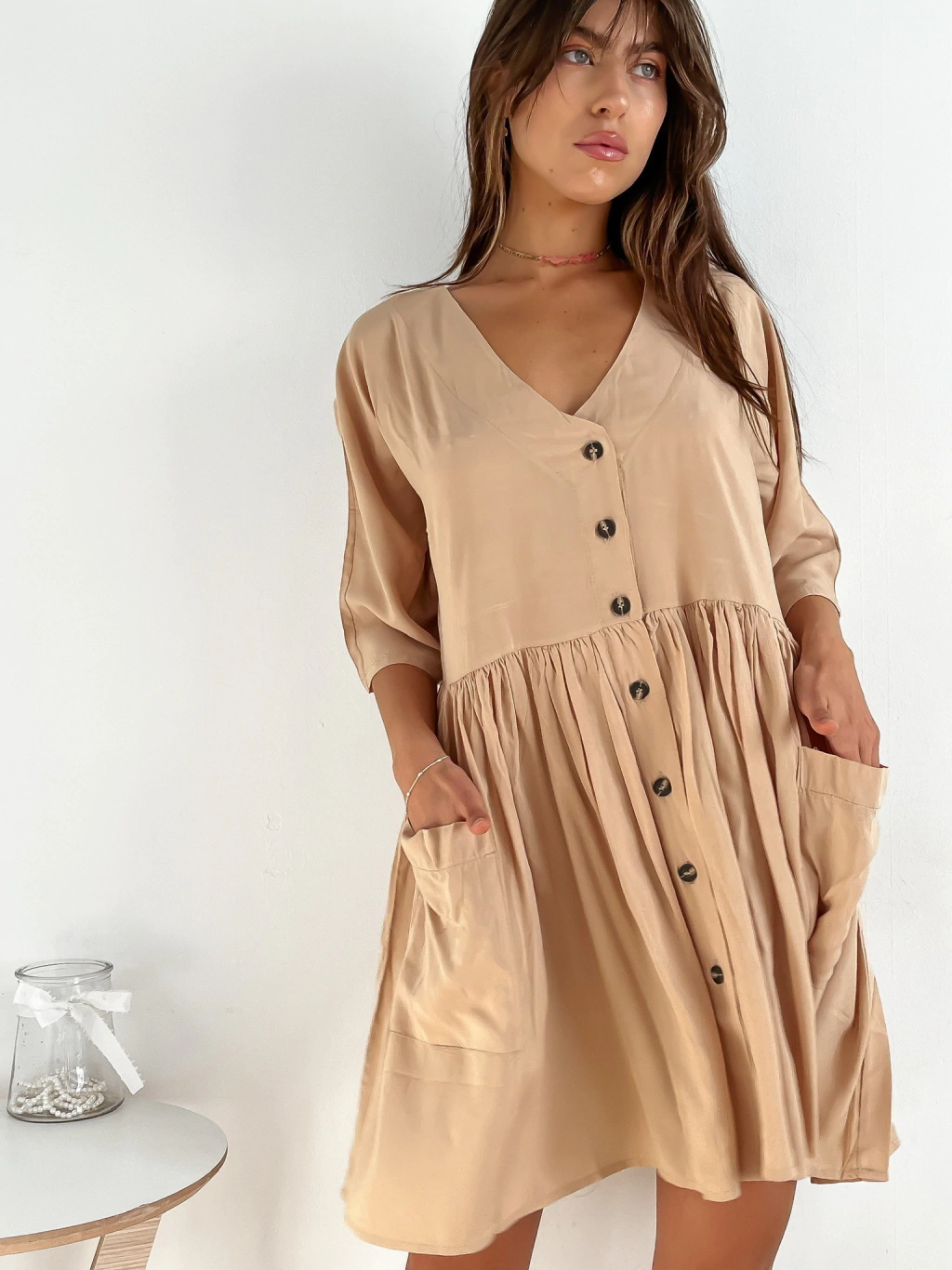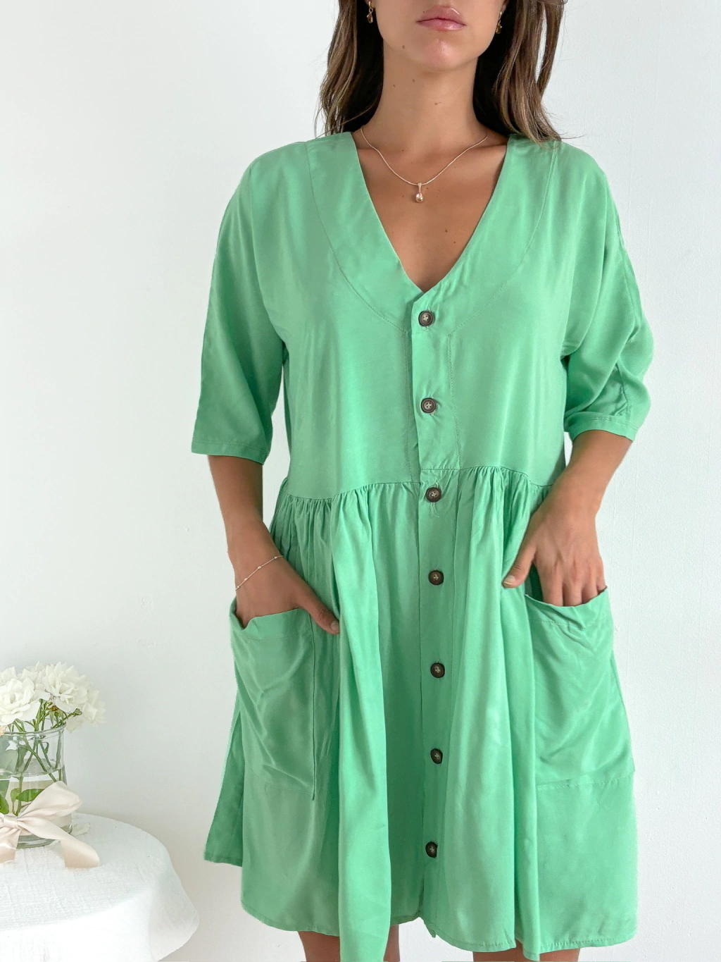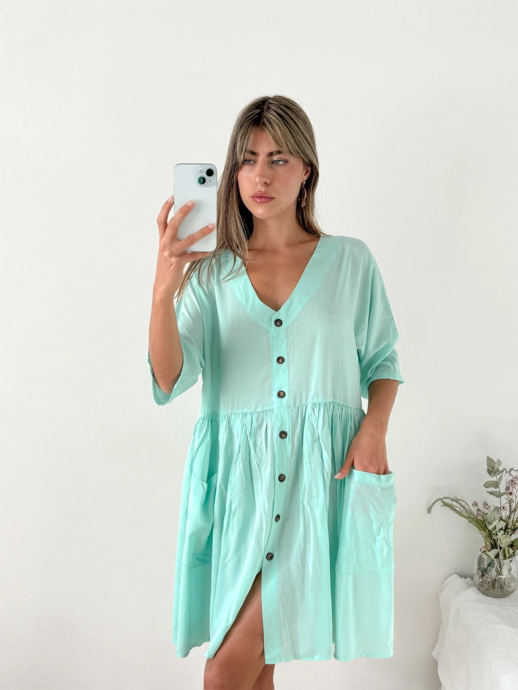 Si buscabas el vestido más cómodo y canchero de la temporada, ¡acá está! 😍 De fibrana livianita y fresca, ideal para los días de calor ☀️ Tiene escote en V, botoncitos al frente y bolsillos que amamos porque siempre vienen bien 🙌 tiene un corte amplio con frunce que queda suelto, relajado y súper favorecedor.