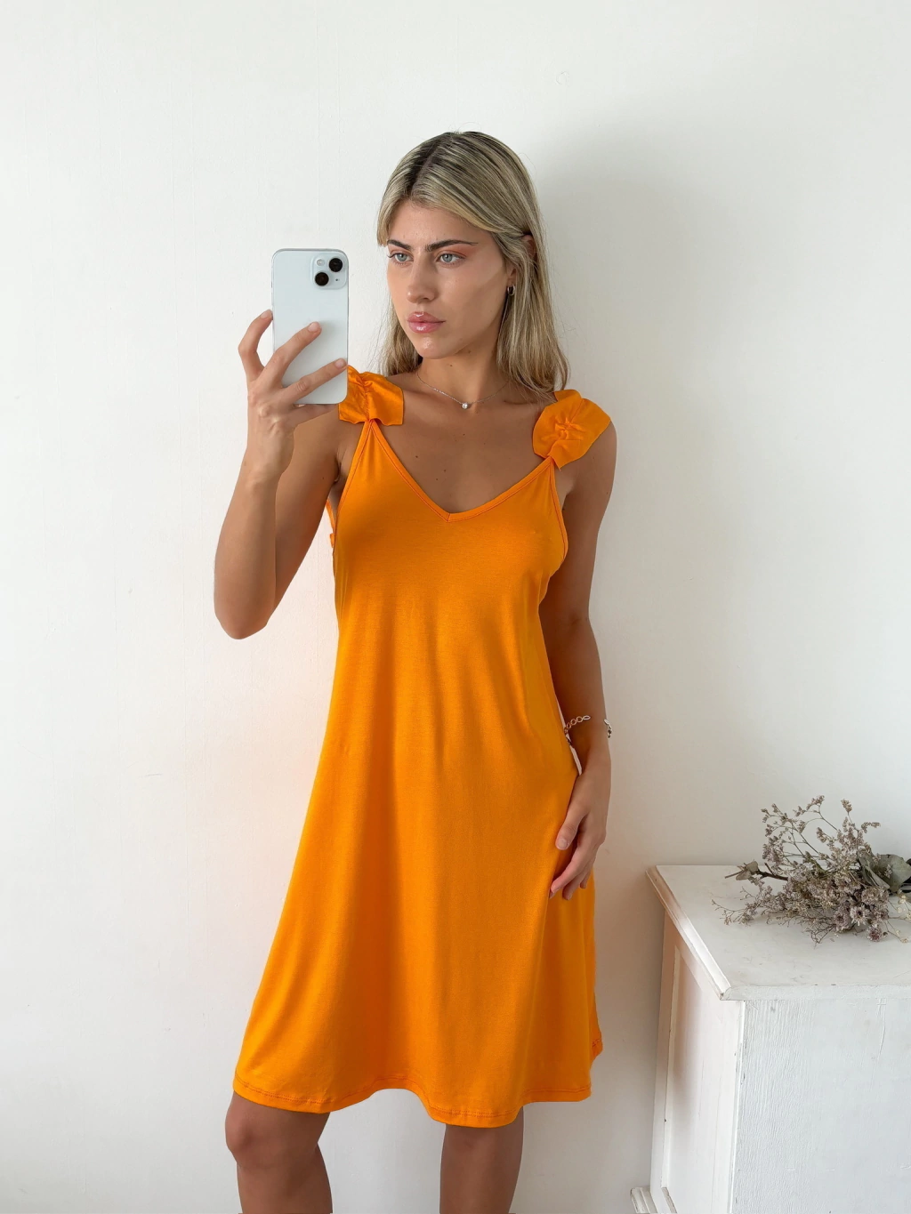Vestido modal viscosa con escote v y volados en bretel. Espalda con escote bajo y recto.