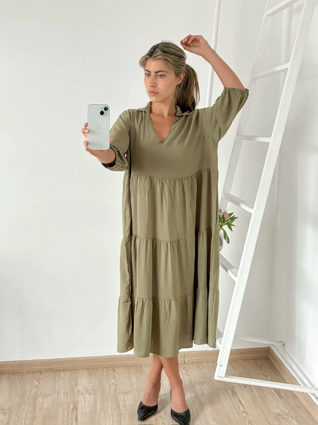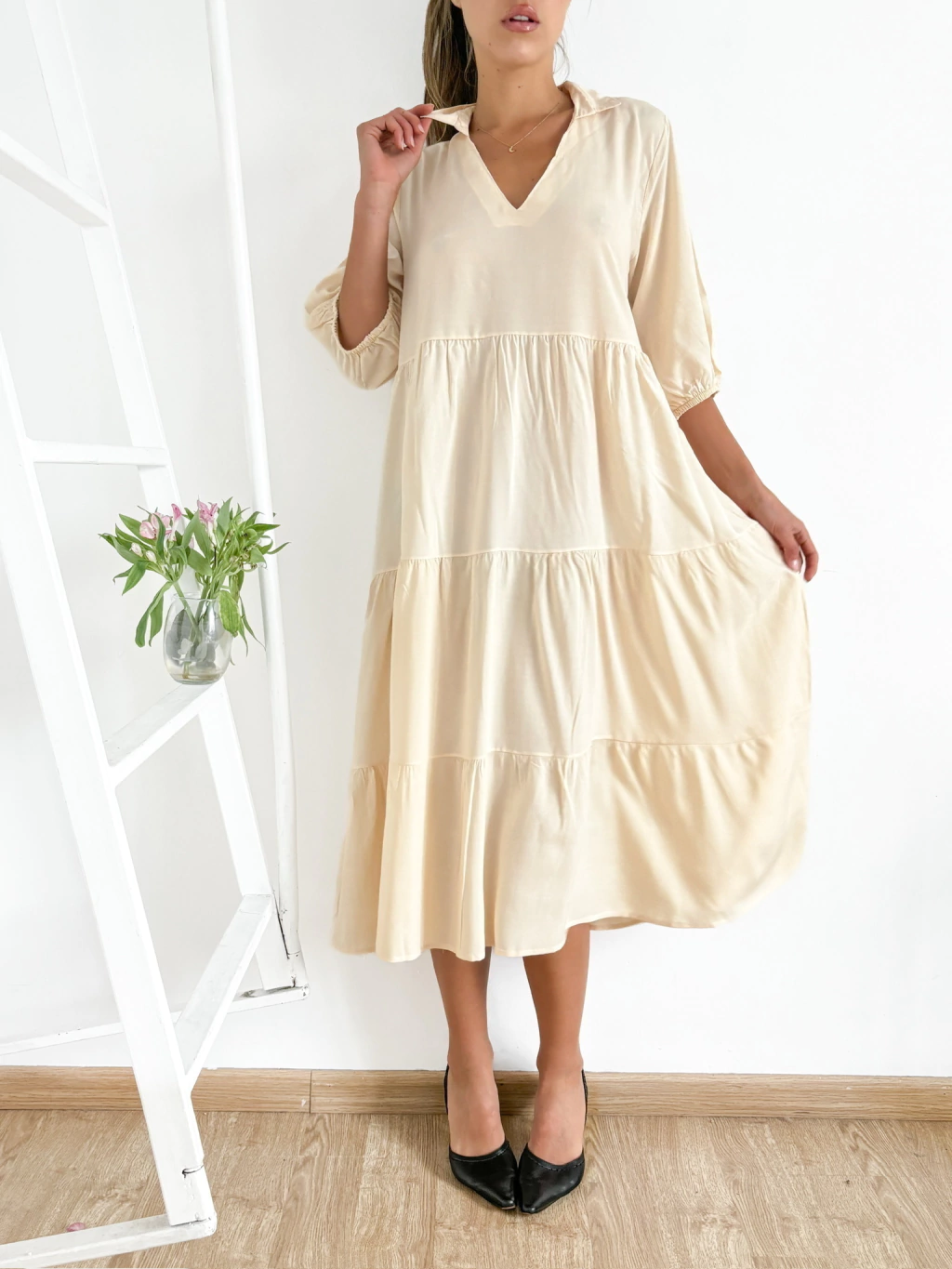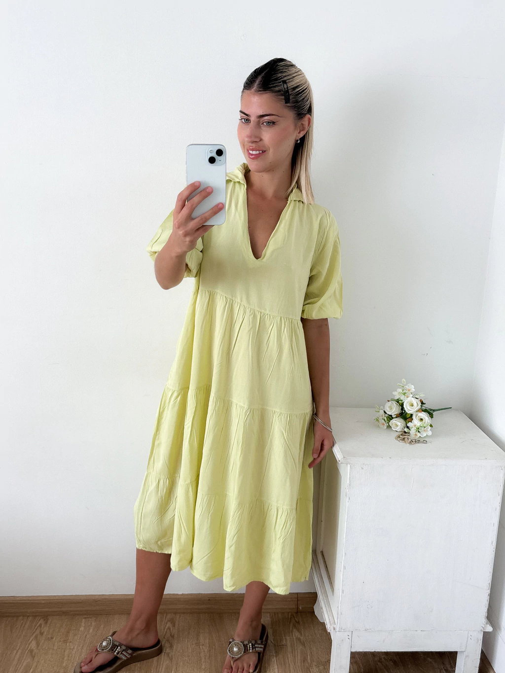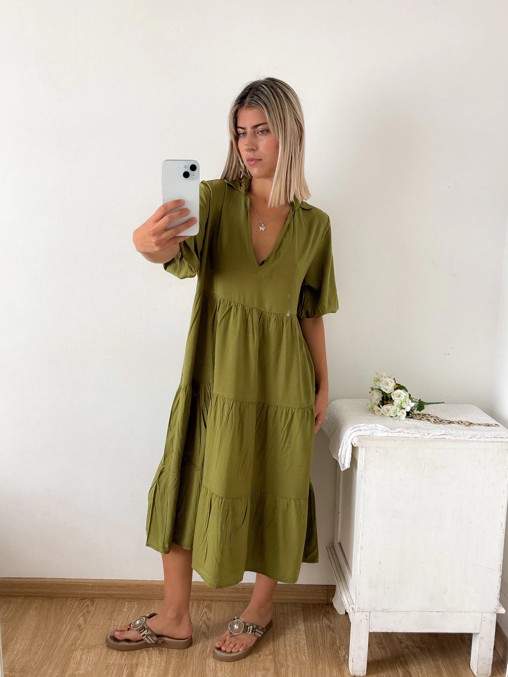 Vestido midi en fibrana, cuello camisero y manga 3/4 abullonada