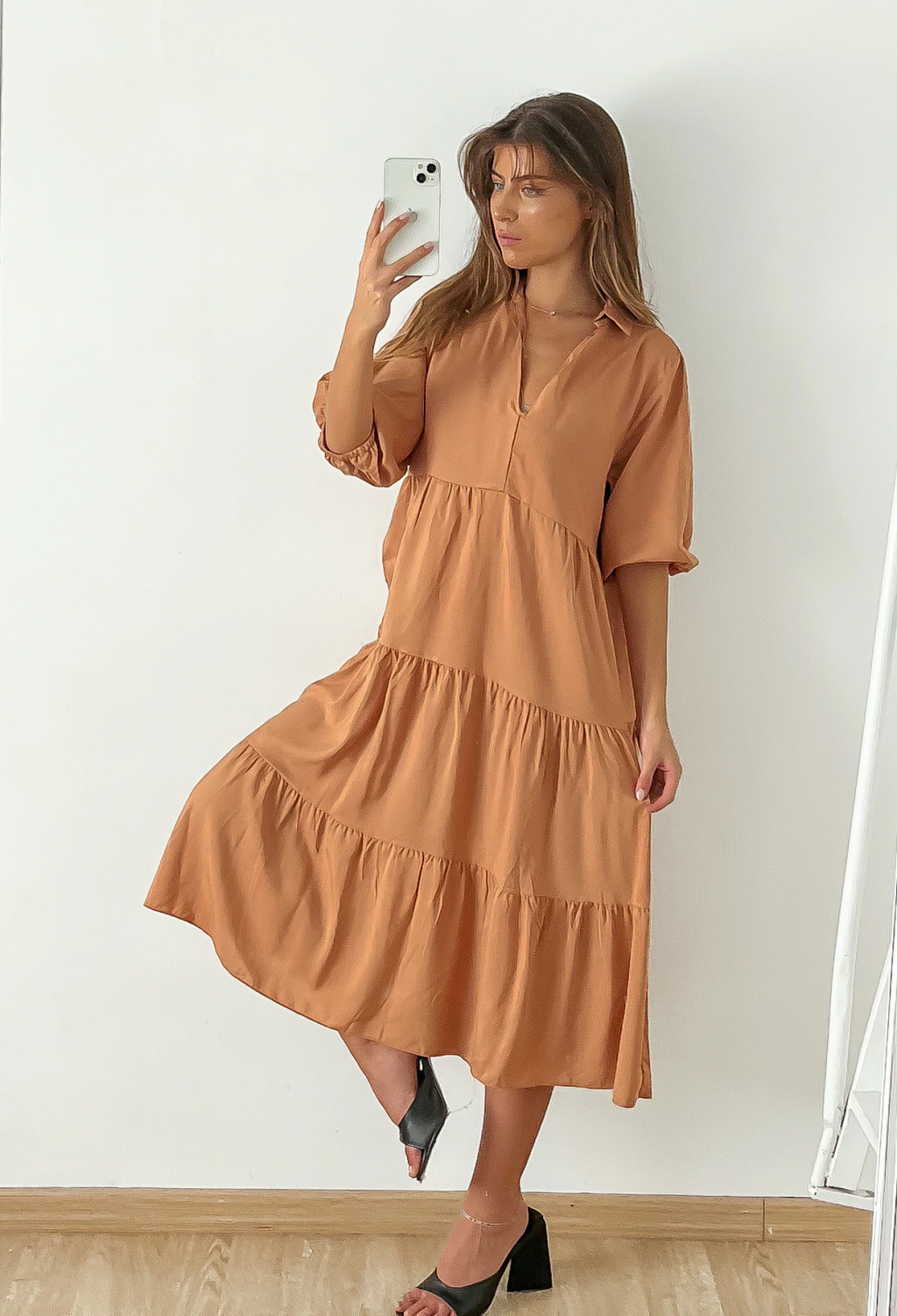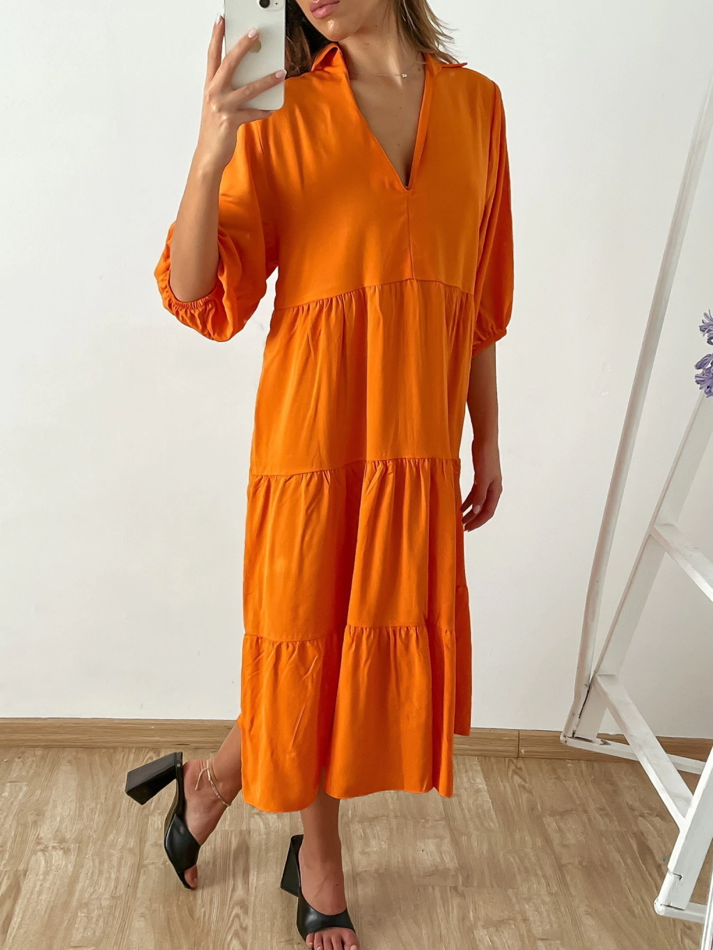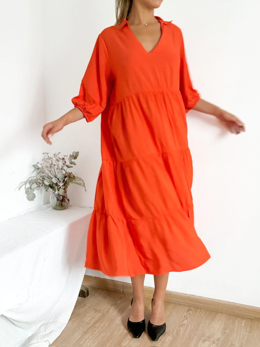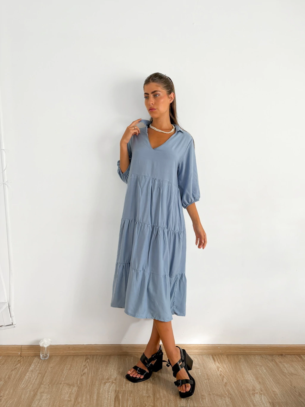 Vestido midi en fibrana, cuello camisero y manga 3/4 abullonada