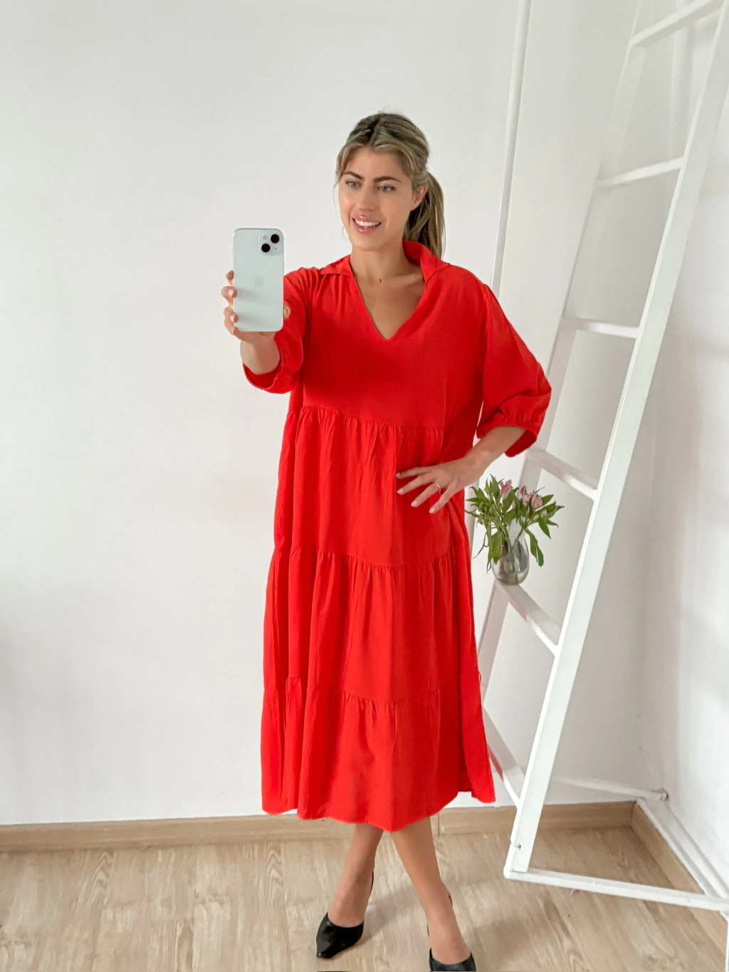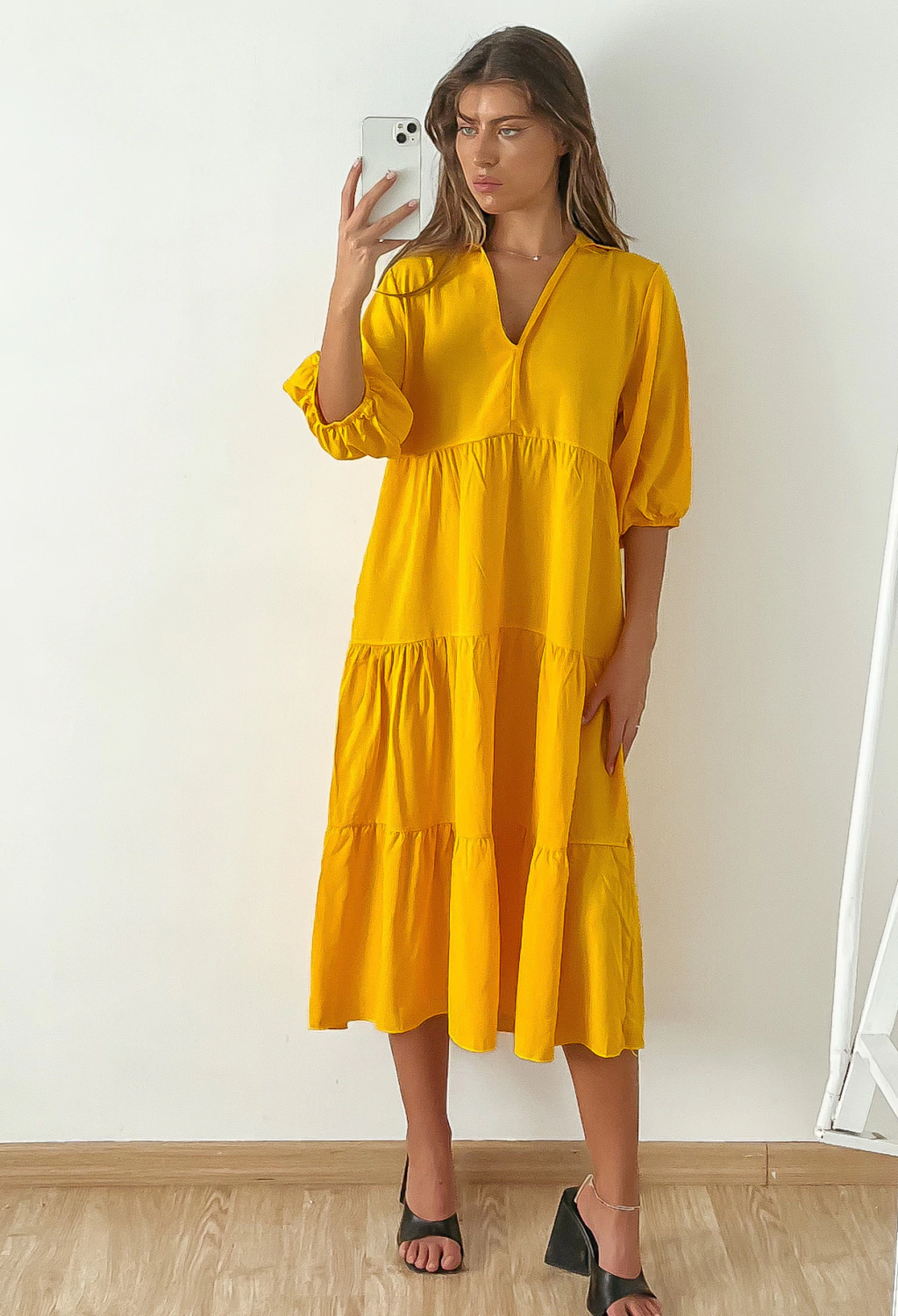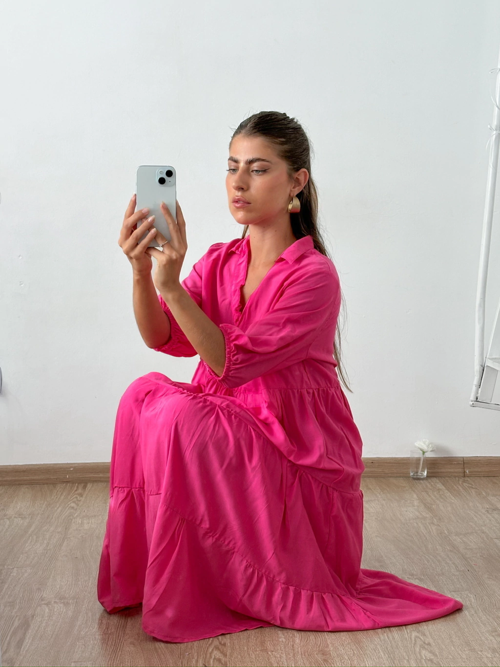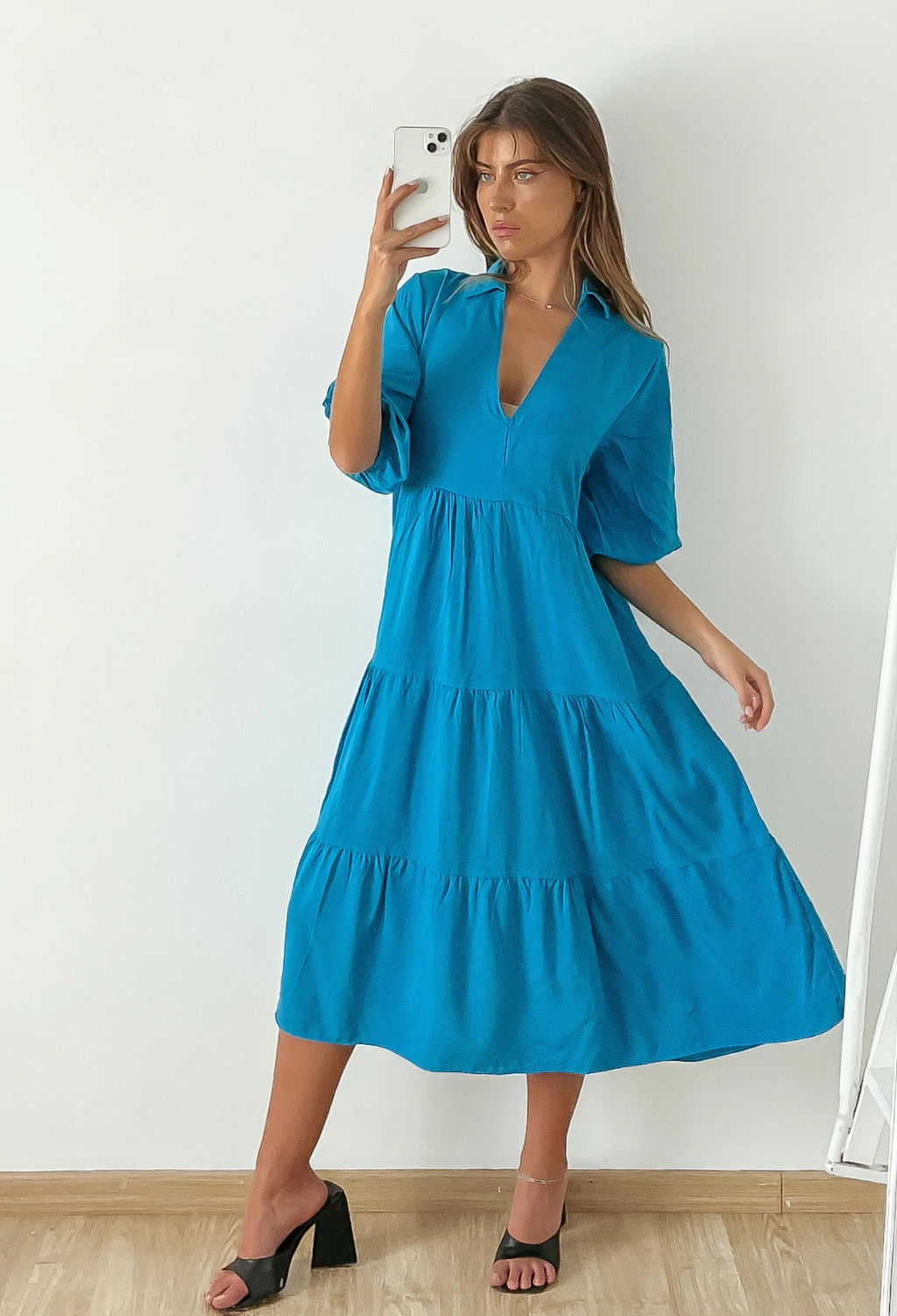 Vestido midi en fibrana, cuello camisero y manga 3/4 abullonada