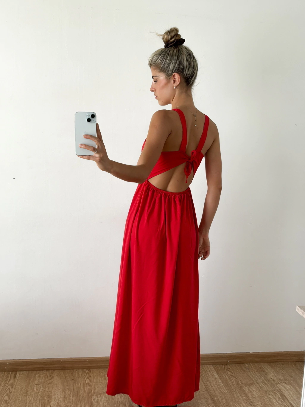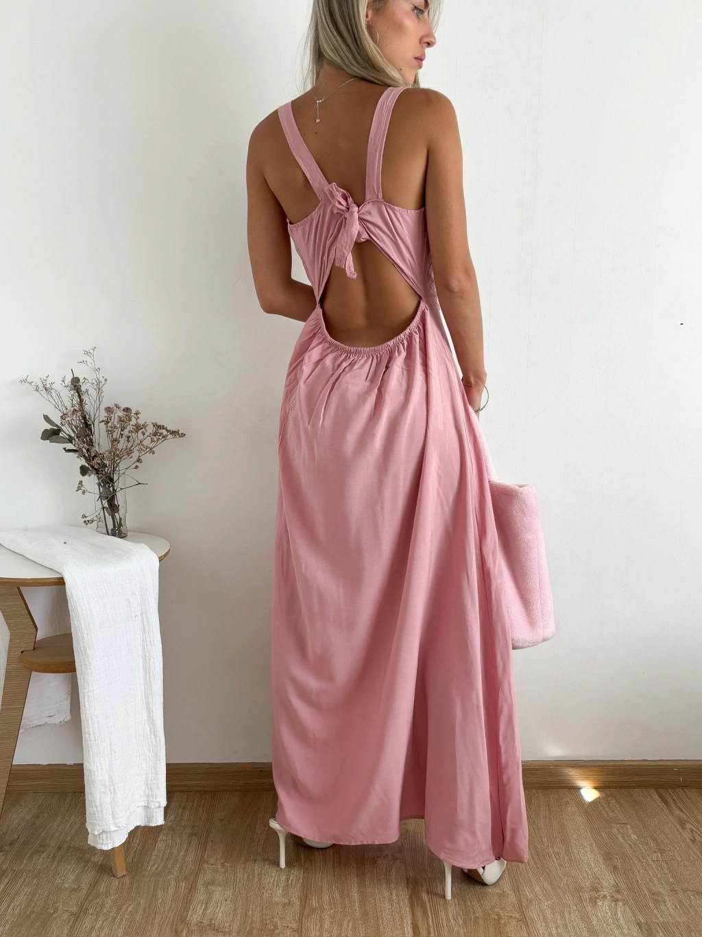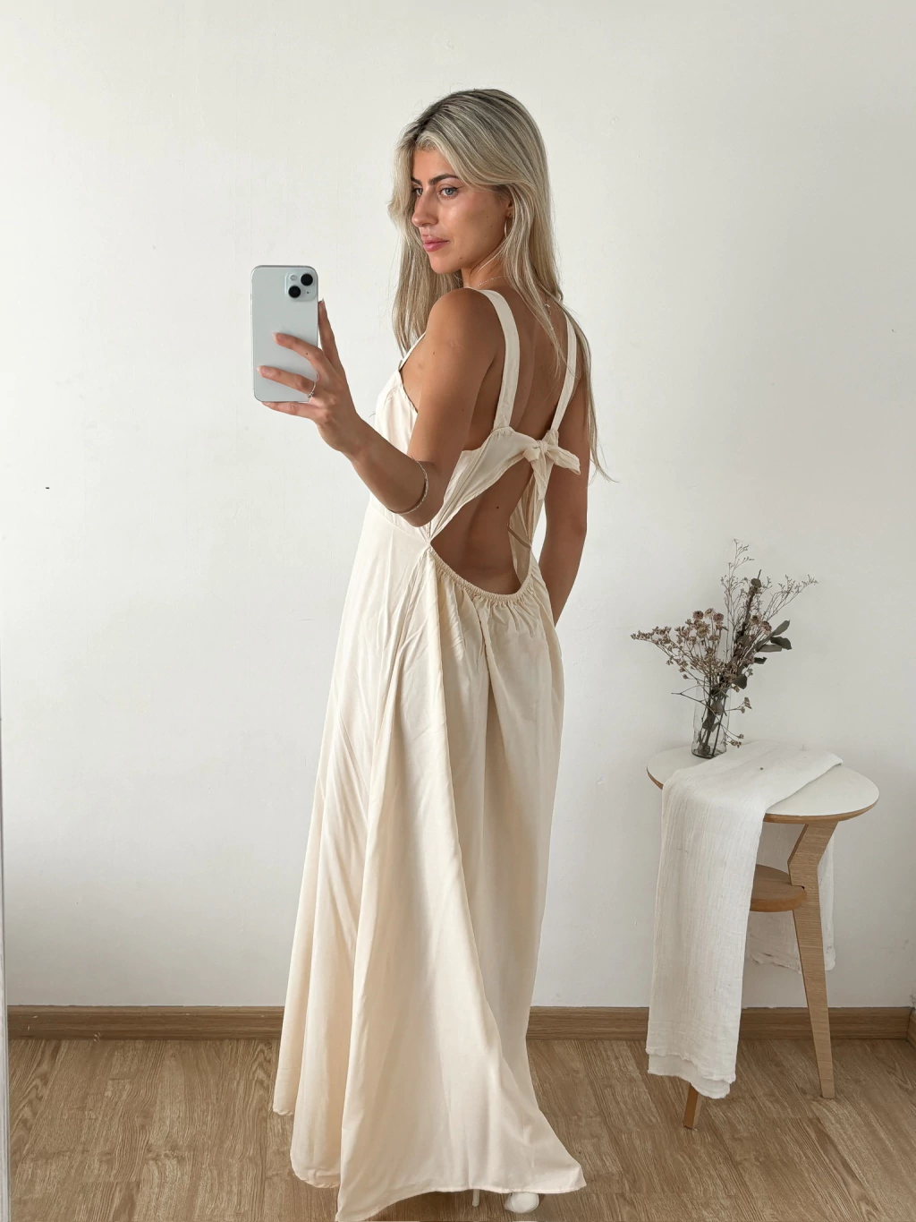 Lo más lindo es su espalda abierta con lazo para anudar: le da ese toque sexy y femenino 💕 y además podés ajustarlo a tu medida para que te quede perfecto y no incomode. Es largo y amplio, lo que le suma movimiento y elegancia al caminar, haciendo que se vea delicado pero con mucha presencia.