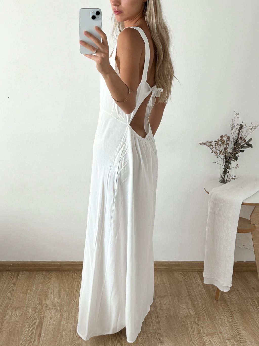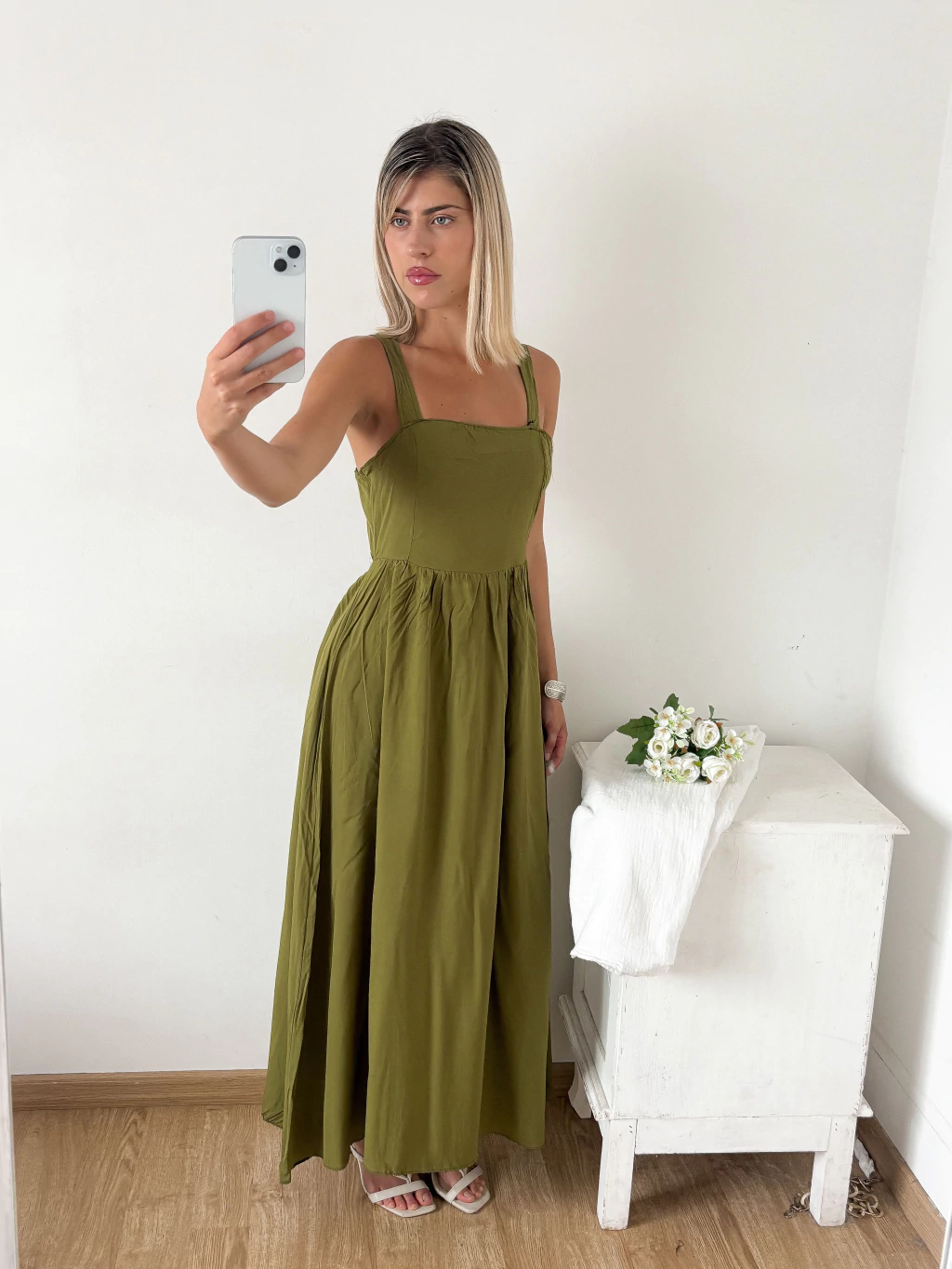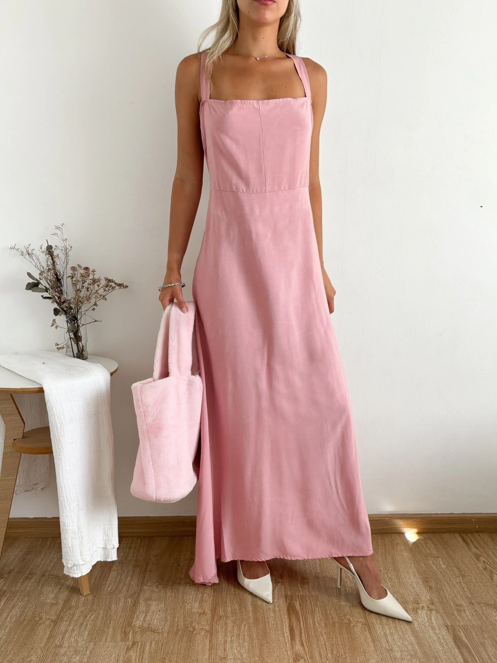 Lo más lindo es su espalda abierta con lazo para anudar: le da ese toque sexy y femenino 💕 y además podés ajustarlo a tu medida para que te quede perfecto y no incomode. Es largo y amplio, lo que le suma movimiento y elegancia al caminar, haciendo que se vea delicado pero con mucha presencia.