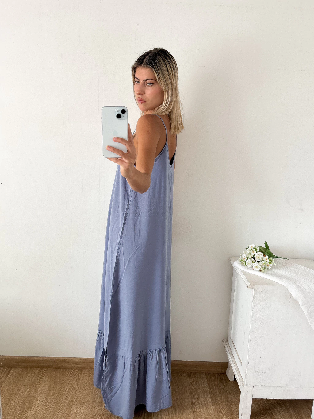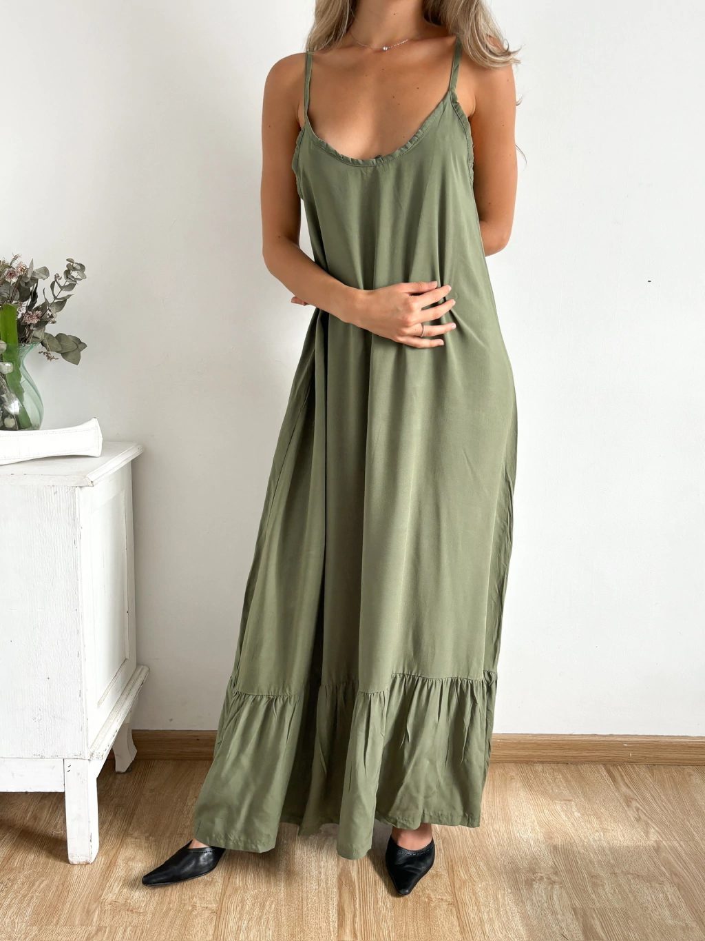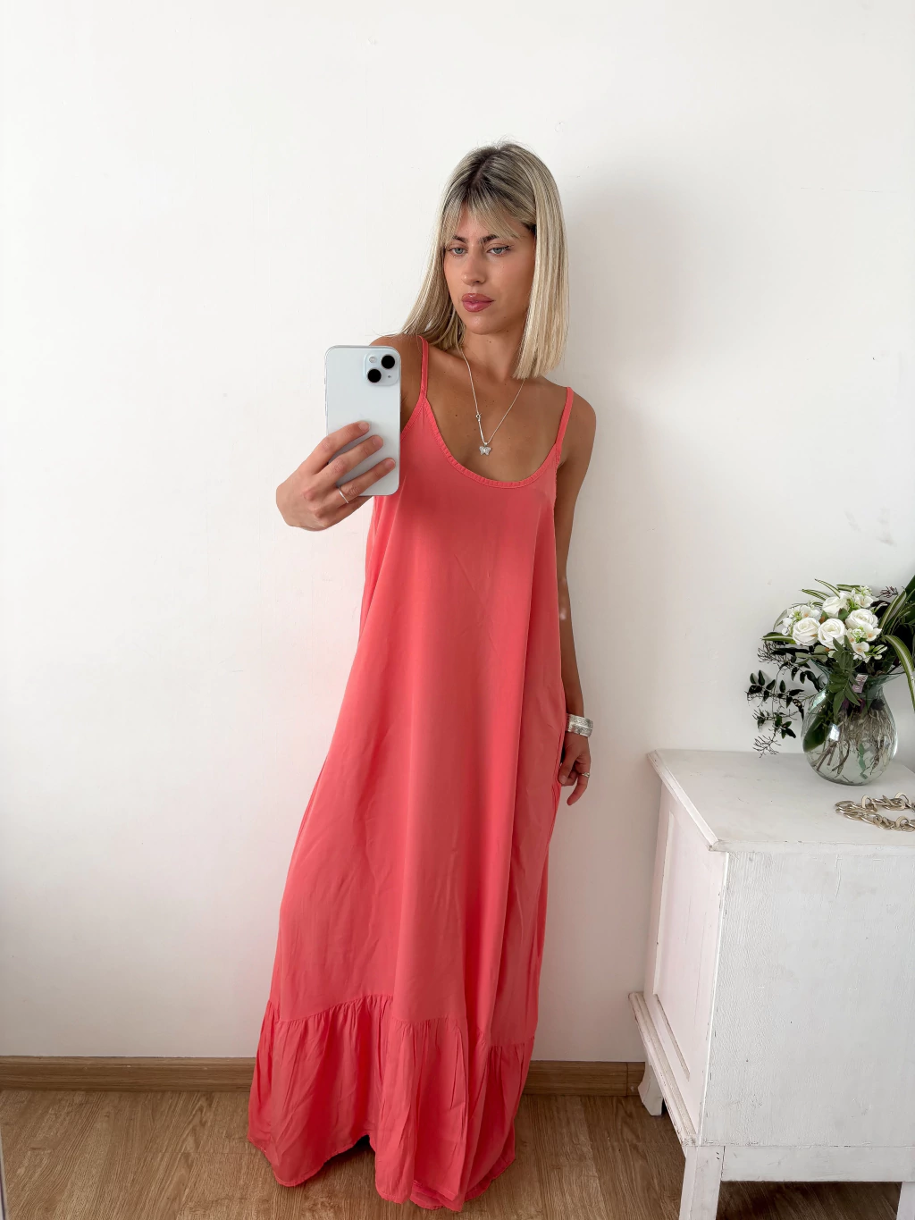 Este vestido es un clásico que nunca falla 💃🏼 Es largo de fibrana liviana y fresca, ideal para los días cálidos. Los breteles finos le dan un toque sexy y delicado, mientras que el volado en el ruedo aporta movimiento y ese aire romántico que lo hace único.
