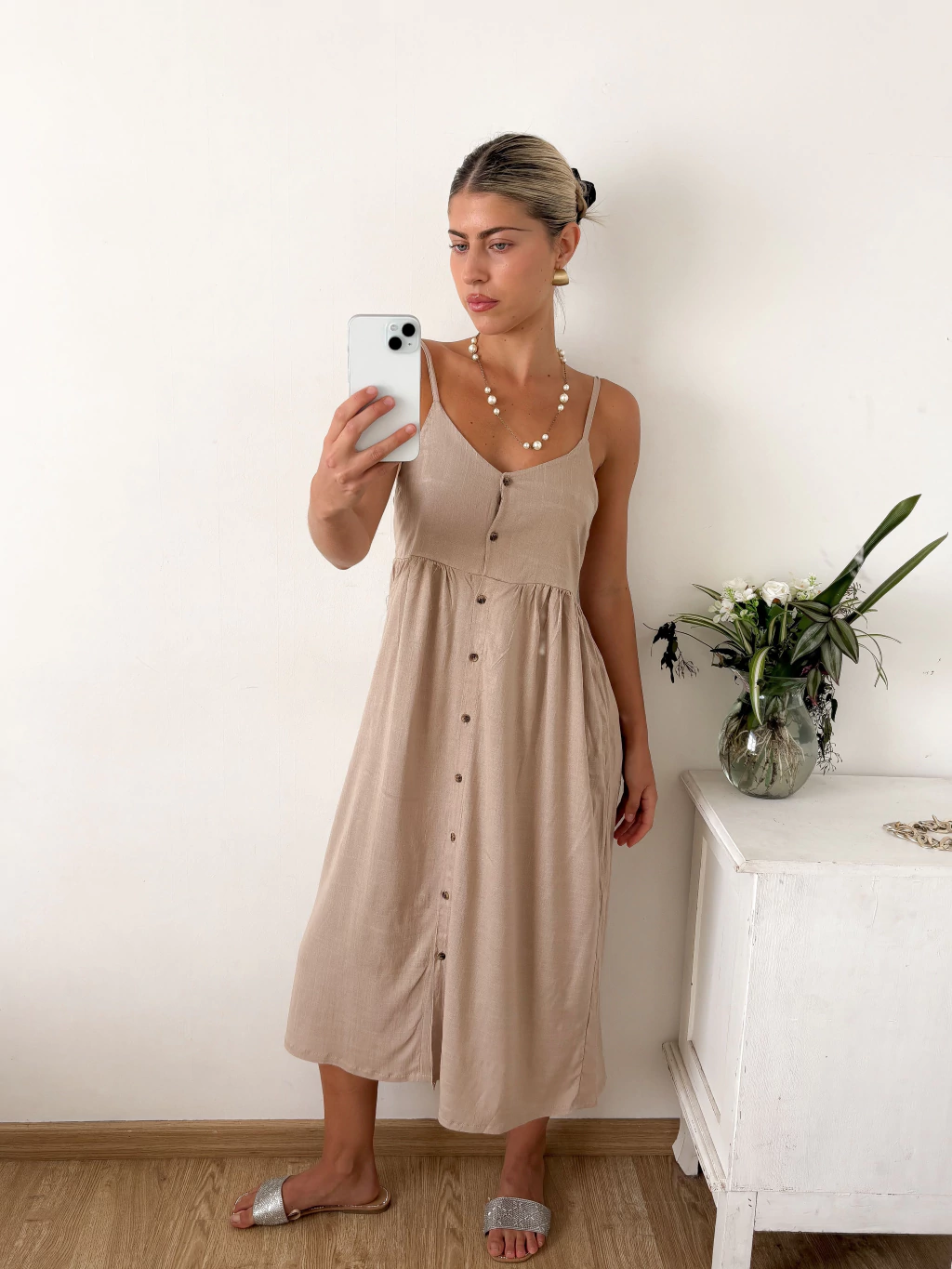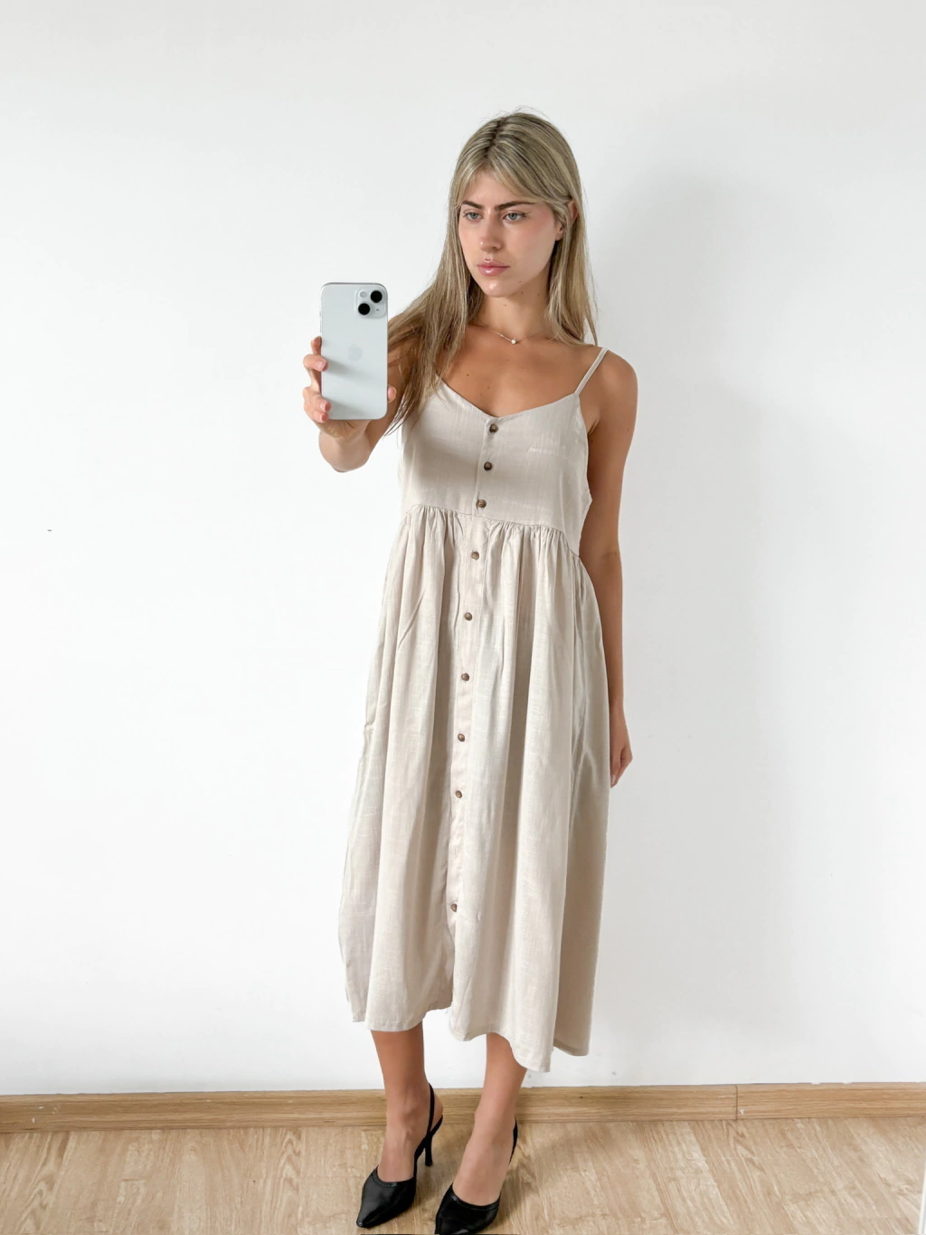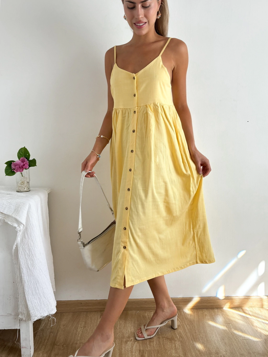 Vestido midi de lino spandex con cartera abotonada en delantero