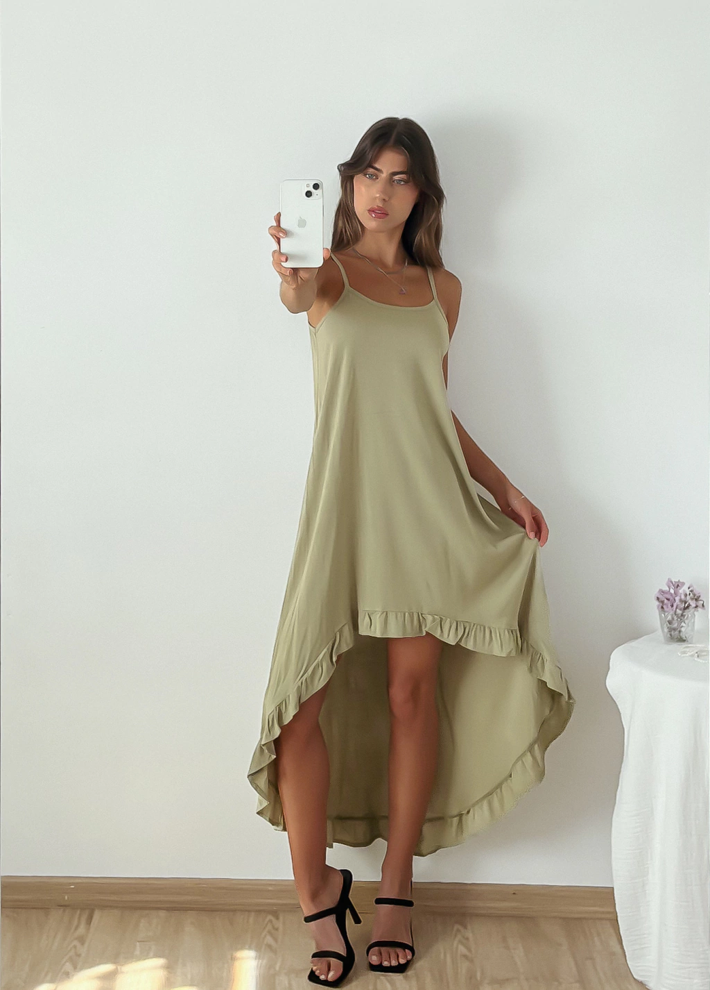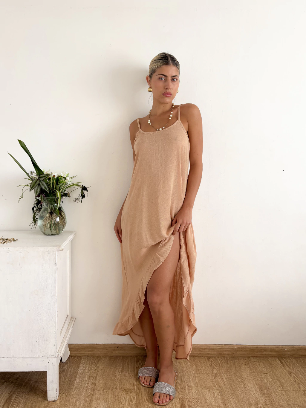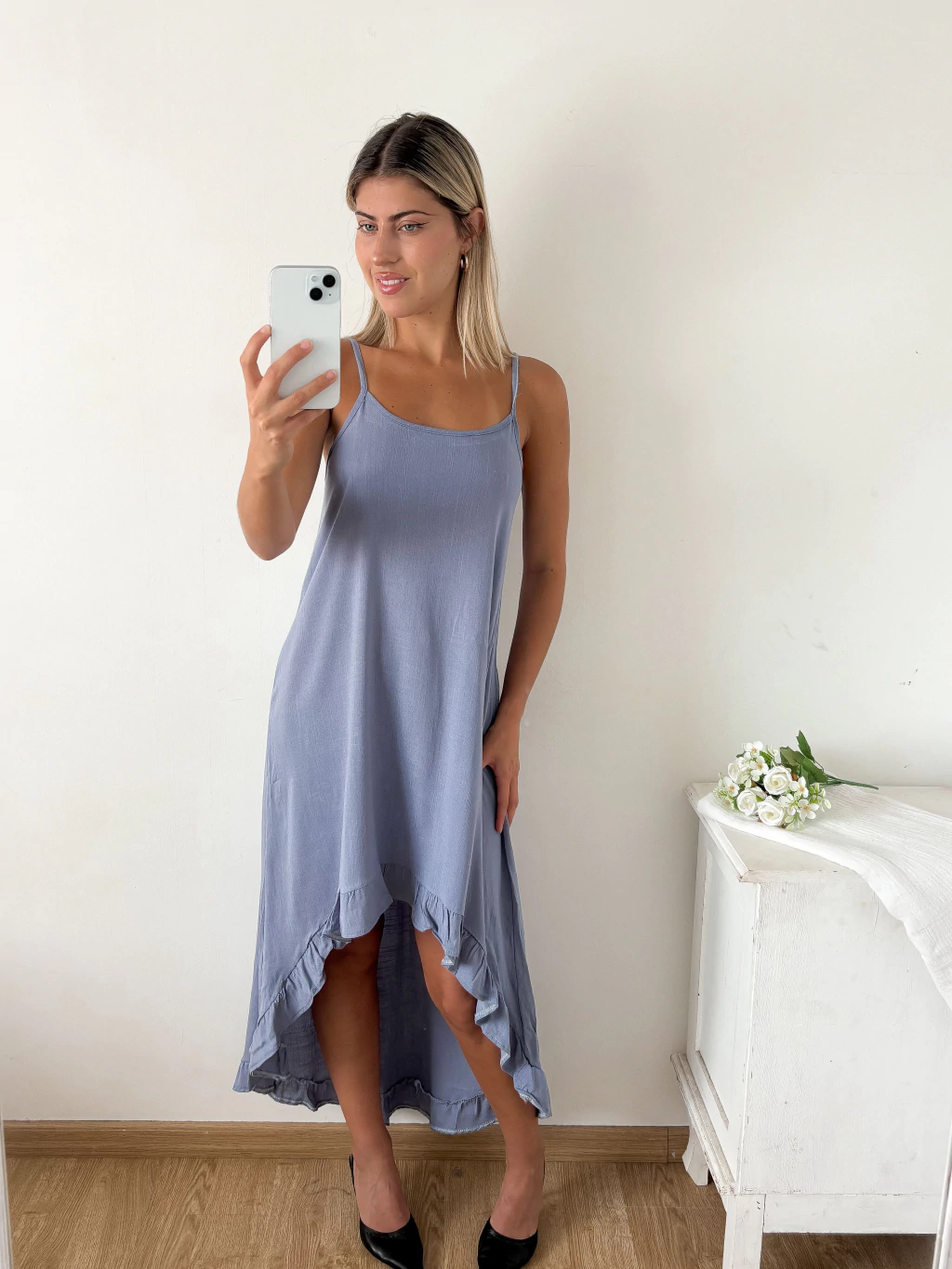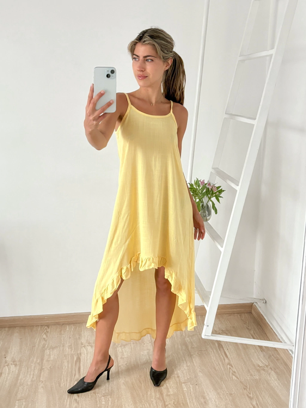 Vestido de lino spandex con breteles finitos y terminacion irregular con volados