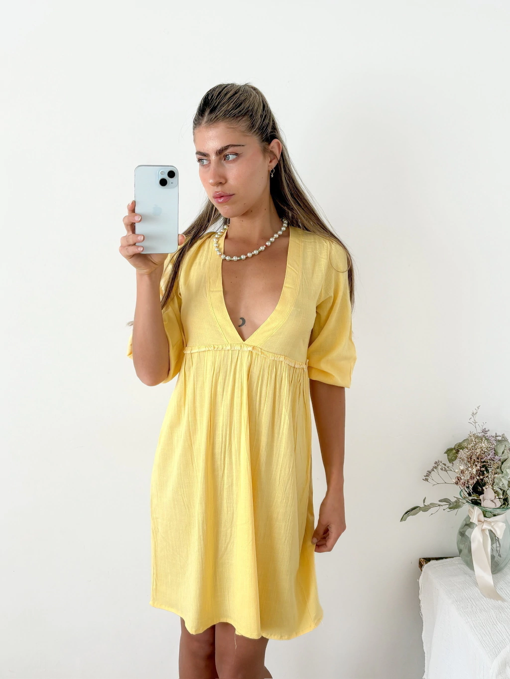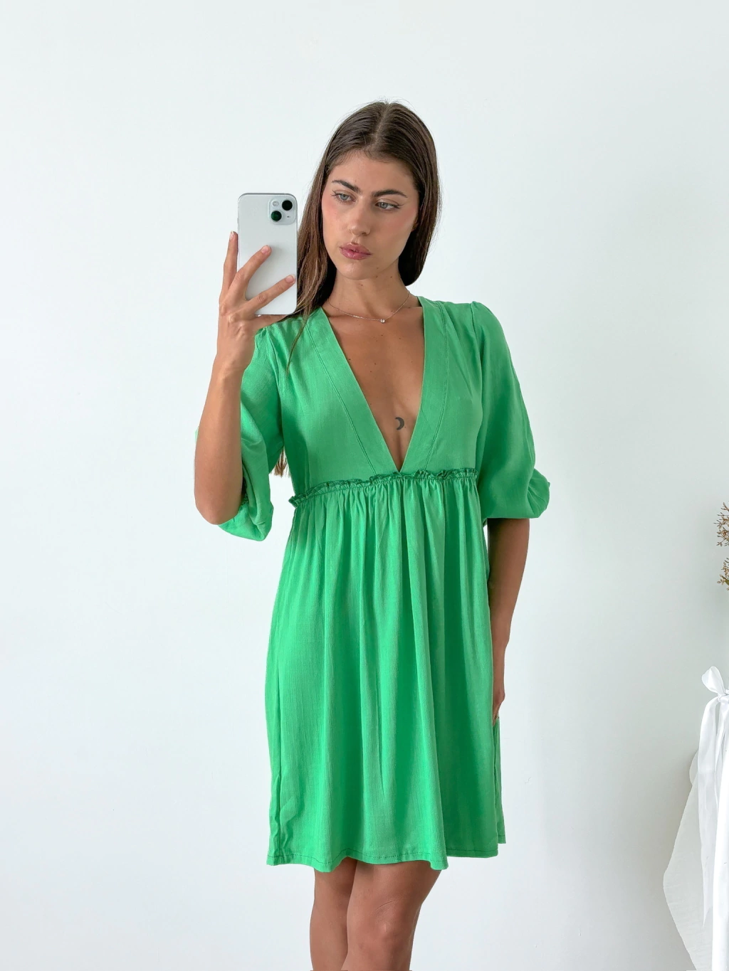 Vestido de lino spandex con escote en V, abertura espalda y manga globo