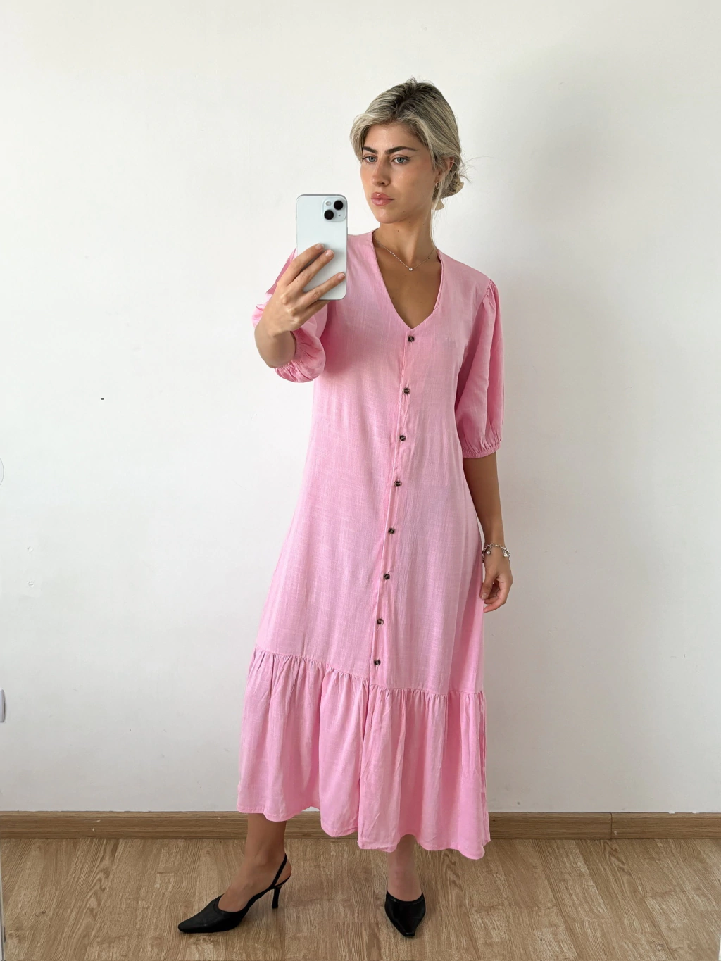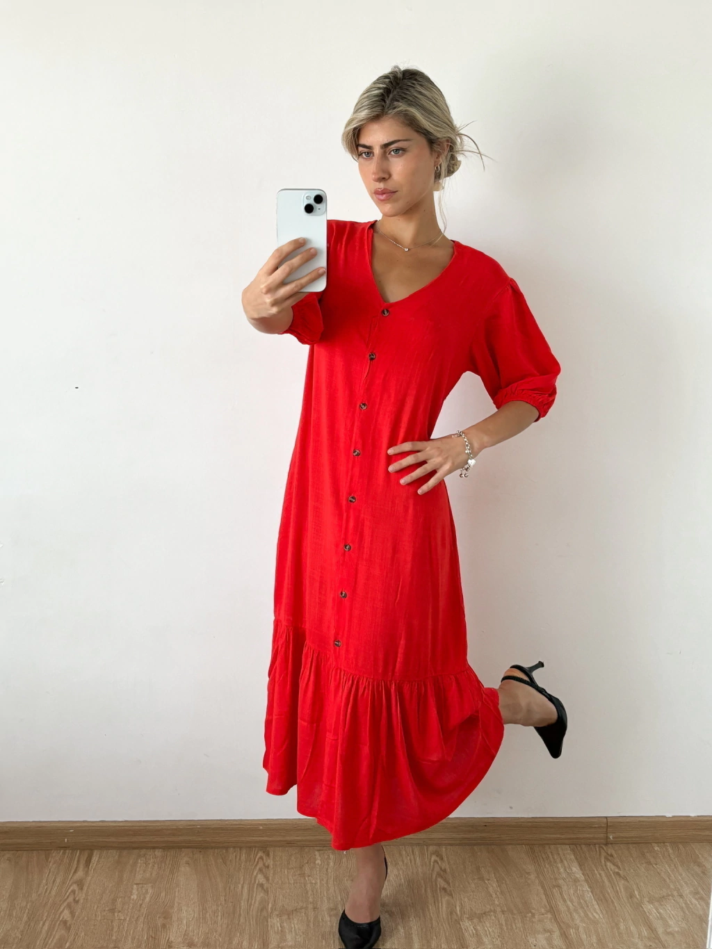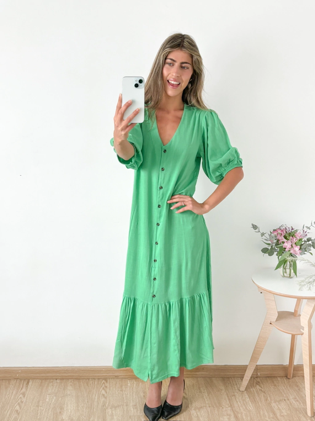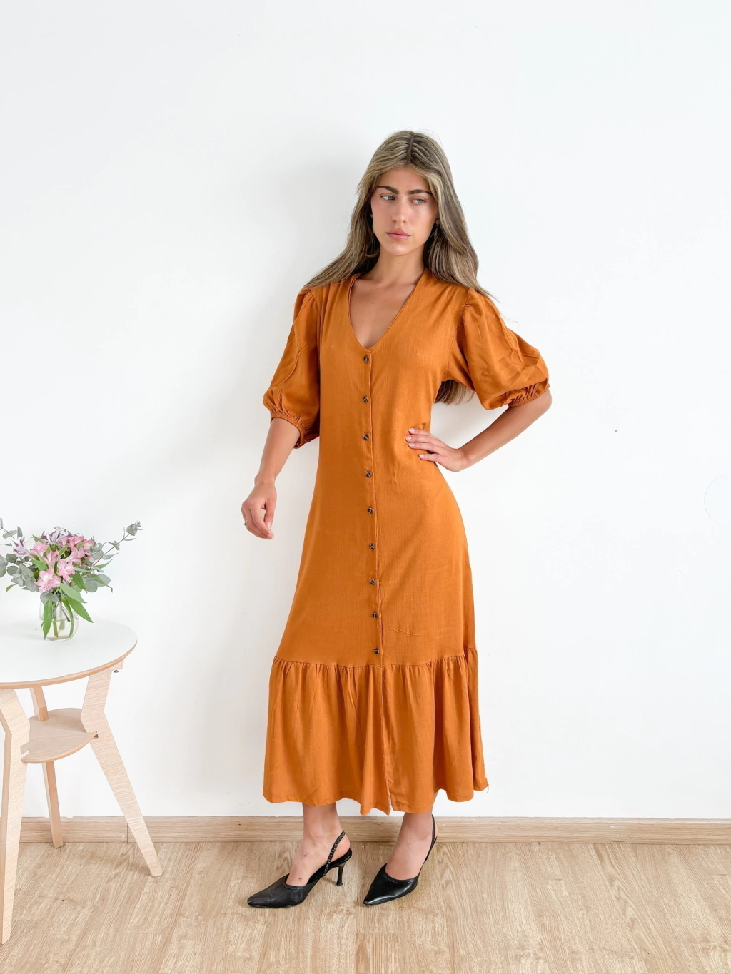 Vestido lino spandex largo abotonado y mangas abullonadas
