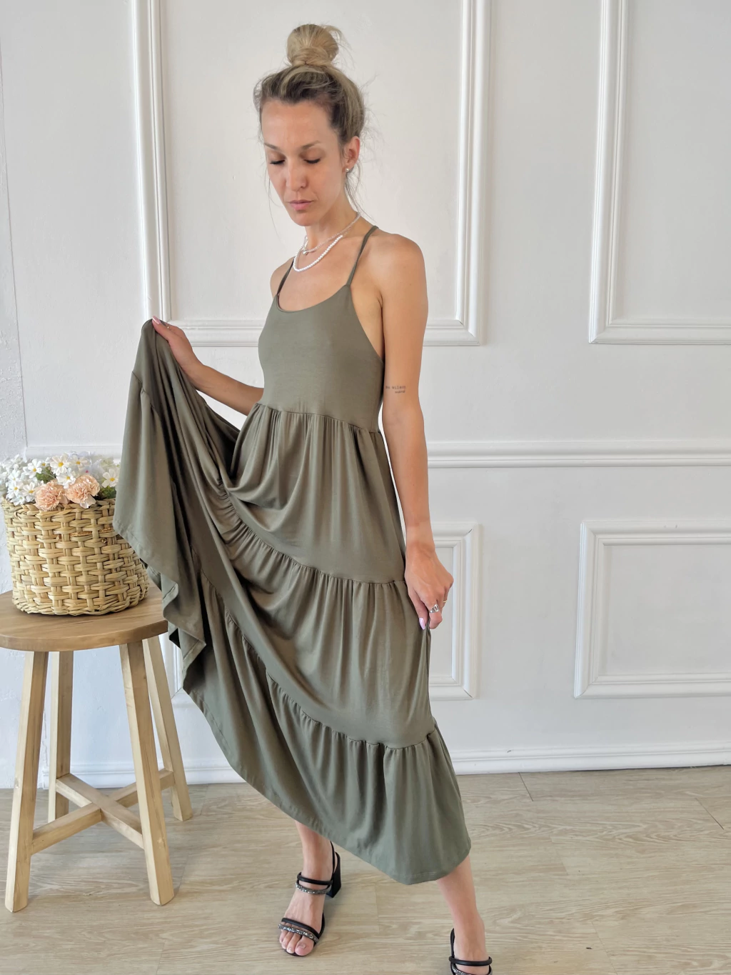 Vestido modal viscosa espalda abierta con vuelo frunces y volados
