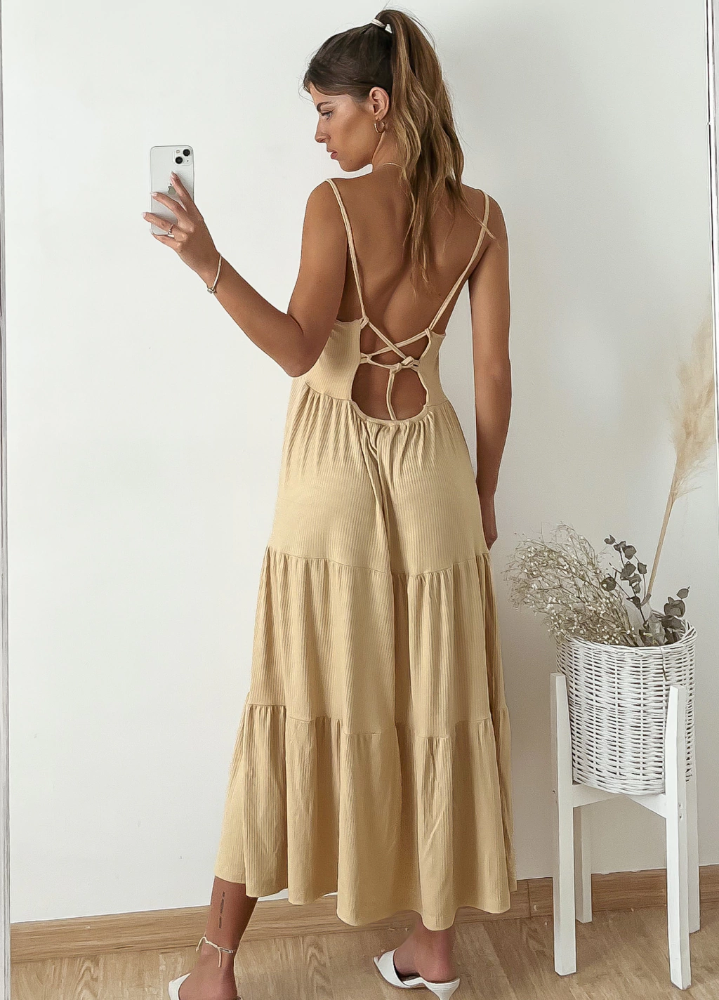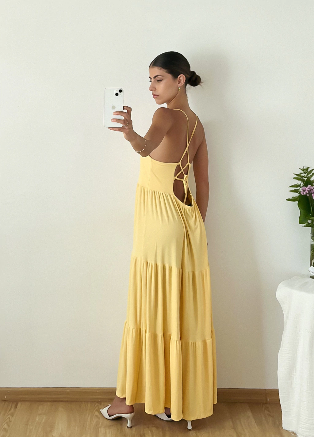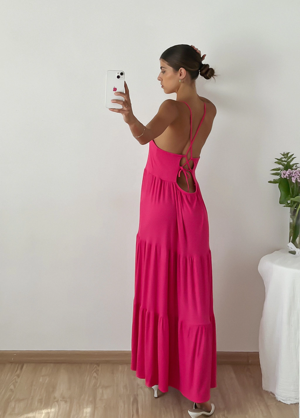 Vestido largo sin mangas, en morley viscosa con espalda abierta con tiras para regular, falda amplia con frunces y volados